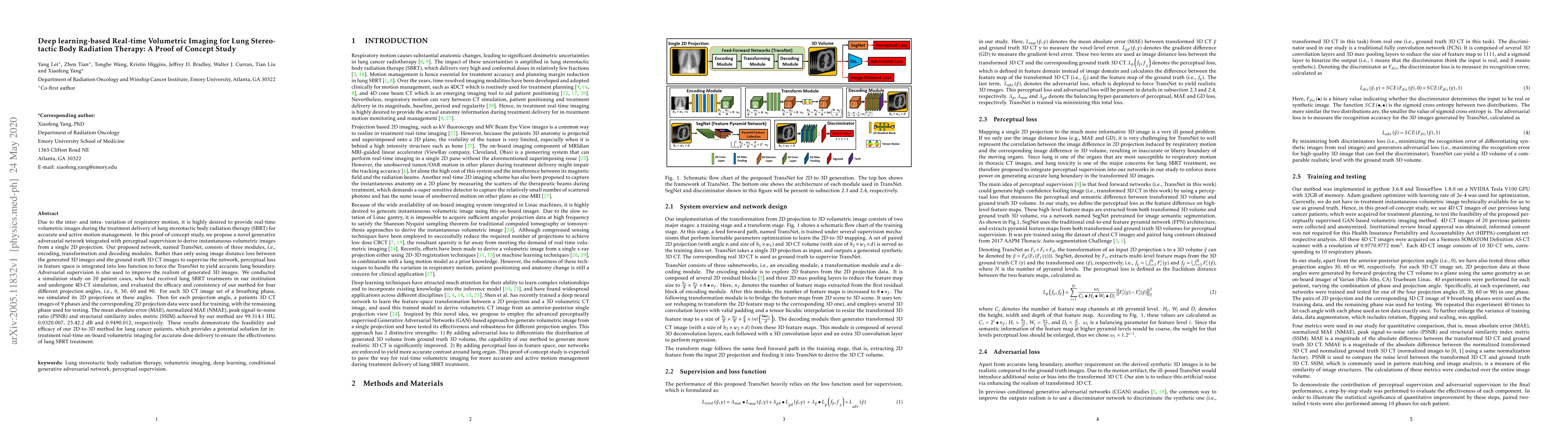 This study proposes a deep learning-based method, TransNet, to generate real-time volumetric images from single 2D projections for lung stereotactic body radiation therapy. The method integrates perceptual and adversarial losses to improve the accuracy and realism of the generated 3D images, demonstrating promising results in a simulation study on 20 patient cases.