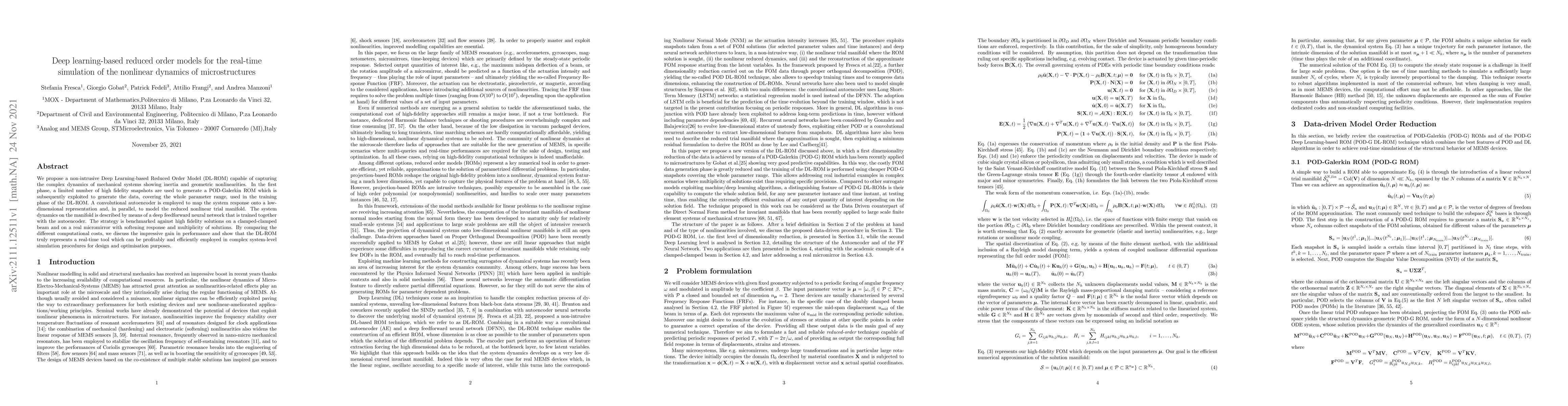 We propose a non-intrusive Deep Learning-based Reduced Order Model (DL-ROM) capable of capturing the complex dynamics of mechanical systems showing inertia and geometric nonlinearities. In the first phase, a limited number of high fidelity snapshots are used to generate a POD-Galerkin ROM which is subsequently exploited to generate the data, covering the whole parameter range, used in the training phase of the DL-ROM. A convolutional autoencoder is employed to map the system response onto a low-dimensional representation and, in parallel, to model the reduced nonlinear trial manifold. The system dynamics on the manifold is described by means of a deep feedforward neural network that is trained together with the autoencoder. The strategy is benchmarked against high fidelity solutions on a clamped-clamped beam and on a real micromirror with softening response and multiplicity of solutions. By comparing the different computational costs, we discuss the impressive gain in performance and show that the DL-ROM truly represents a real-time tool which can be profitably and efficiently employed in complex system-level simulation procedures for design and optimisation purposes.