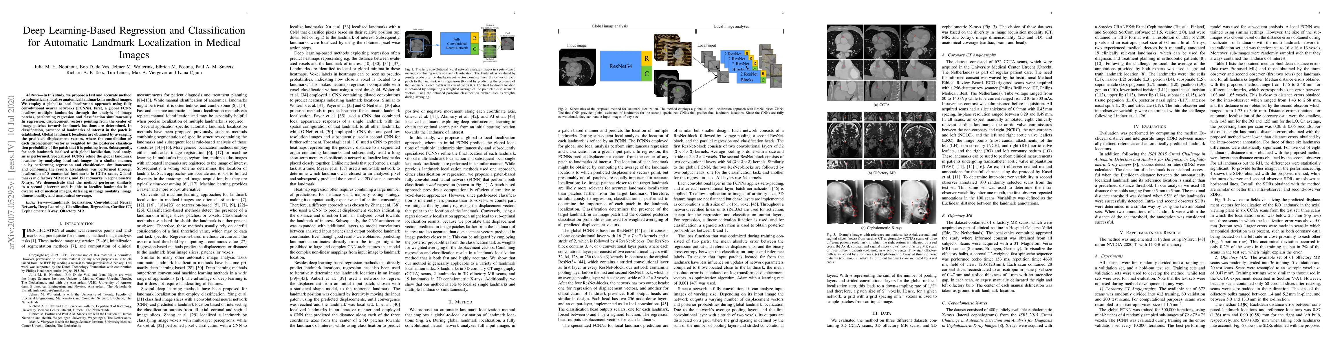This study proposes a deep learning-based method using fully convolutional neural networks for automatic localization of anatomical landmarks in medical images, combining global and local analysis for improved accuracy. The method was evaluated on various medical image types, showing comparable performance to a second observer.
