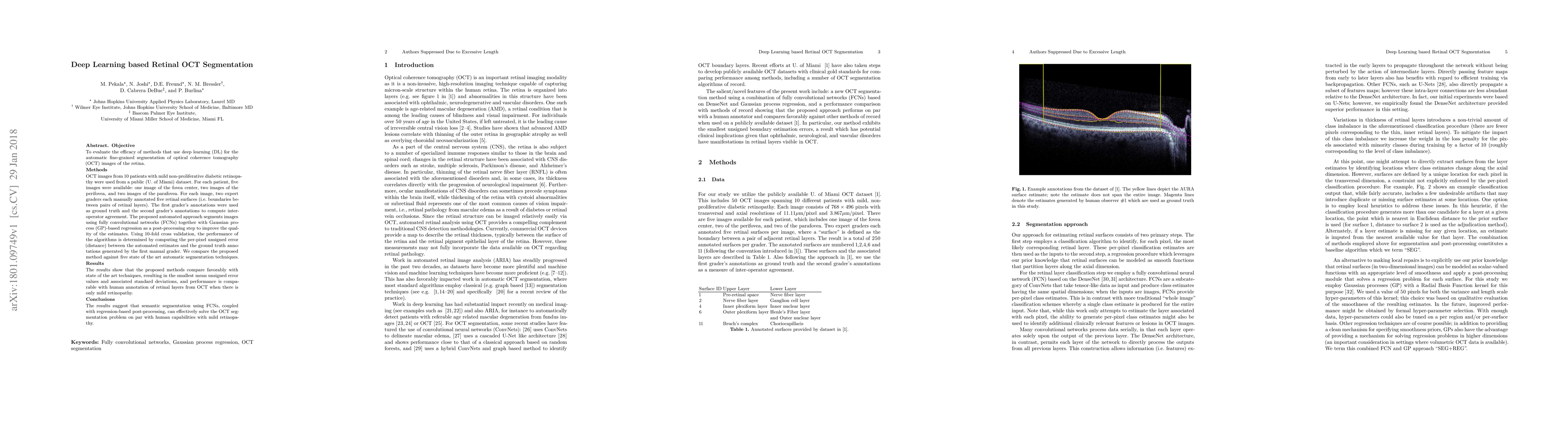 This paper evaluates deep learning methods for segmenting retinal OCT images, showing that fully convolutional networks with Gaussian process regression post-processing achieve the smallest mean unsigned error compared to state-of-the-art techniques, indicating comparable performance to human graders in mild non-proliferative diabetic retinopathy cases.