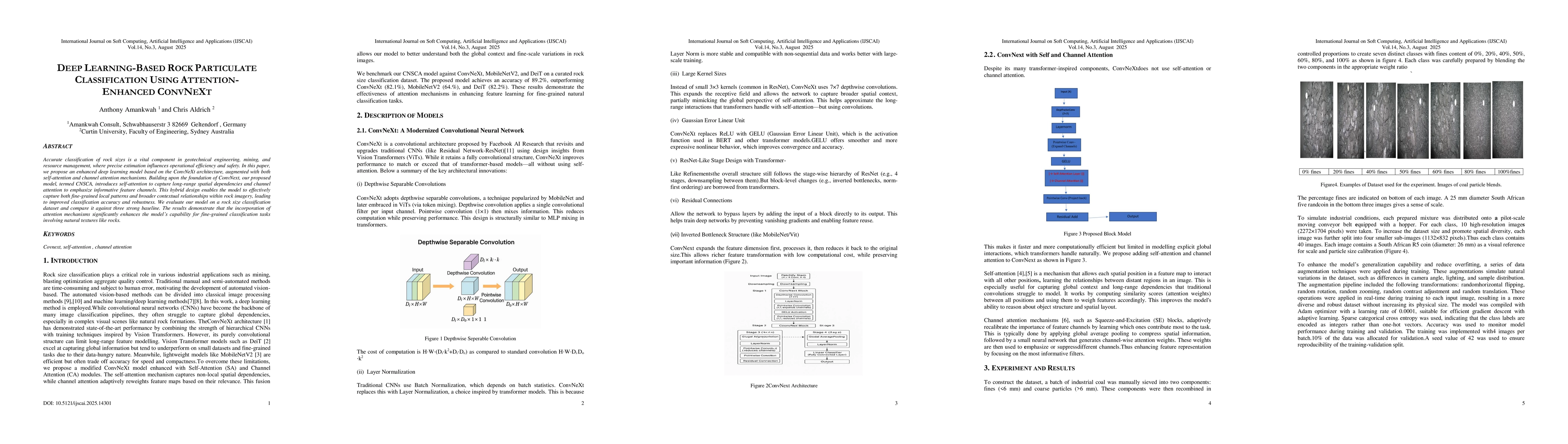 Accurate classification of rock sizes is a vital component in geotechnical engineering, mining, and resource management, where precise estimation influences operational efficiency and safety. In this paper, we propose an enhanced deep learning model based on the ConvNeXt architecture, augmented with both self-attention and channel attention mechanisms. Building upon the foundation of ConvNext, our proposed model, termed CNSCA, introduces self-attention to capture long-range spatial dependencies and channel attention to emphasize informative feature channels. This hybrid design enables the model to effectively capture both fine-grained local patterns and broader contextual relationships within rock imagery, leading to improved classification accuracy and robustness. We evaluate our model on a rock size classification dataset and compare it against three strong baseline. The results demonstrate that the incorporation of attention mechanisms significantly enhances the models capability for fine-grained classification tasks involving natural textures like rocks.