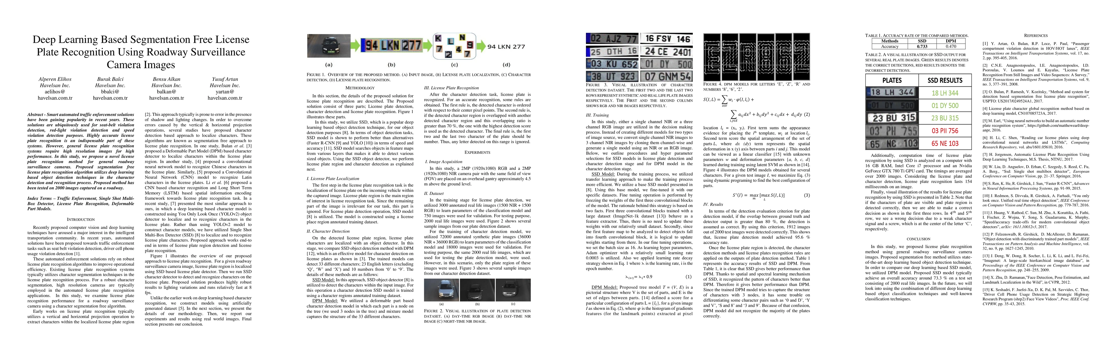 Smart automated traffic enforcement solutions have been gaining popularity in recent years. These solutions are ubiquitously used for seat-belt violation detection, red-light violation detection and speed violation detection purposes. Highly accurate license plate recognition is an indispensable part of these systems. However, general license plate recognition systems require high resolution images for high performance. In this study, we propose a novel license plate recognition method for general roadway surveillance cameras. Proposed segmentation free license plate recognition algorithm utilizes deep learning based object detection techniques in the character detection and recognition process. Proposed method has been tested on 2000 images captured on a roadway.