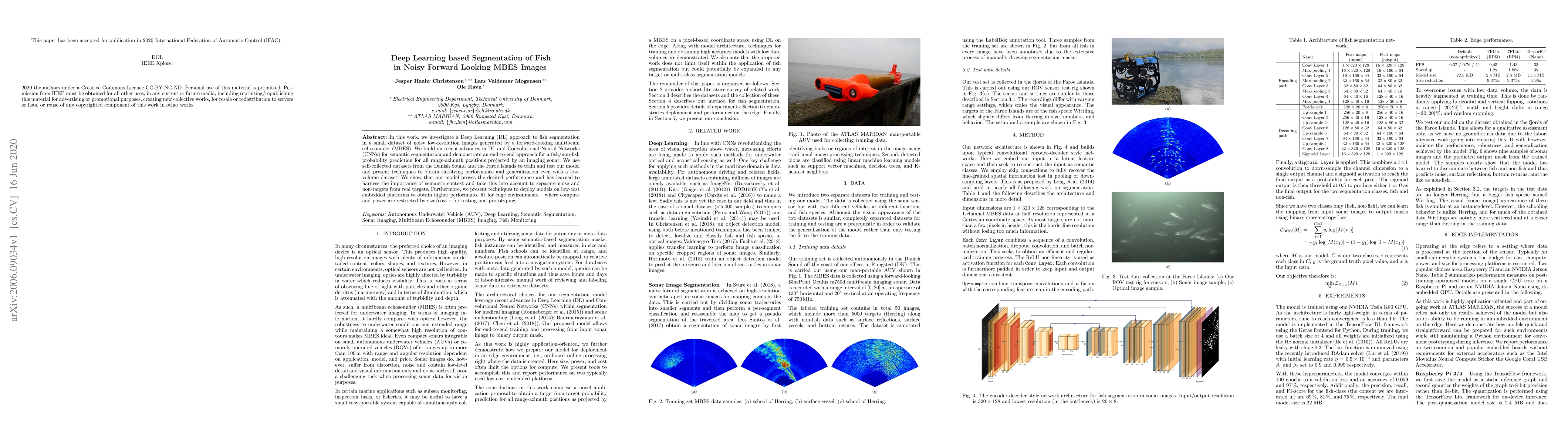 In this work, we investigate a Deep Learning (DL) approach to fish segmentation in a small dataset of noisy low-resolution images generated by a forward-looking multibeam echosounder (MBES). We build on recent advances in DL and Convolutional Neural Networks (CNNs) for semantic segmentation and demonstrate an end-to-end approach for a fish/non-fish probability prediction for all range-azimuth positions projected by an imaging sonar. We use self-collected datasets from the Danish Sound and the Faroe Islands to train and test our model and present techniques to obtain satisfying performance and generalization even with a low-volume dataset. We show that our model proves the desired performance and has learned to harness the importance of semantic context and take this into account to separate noise and non-targets from real targets. Furthermore, we present techniques to deploy models on low-cost embedded platforms to obtain higher performance fit for edge environments - where compute and power are restricted by size/cost - for testing and prototyping.