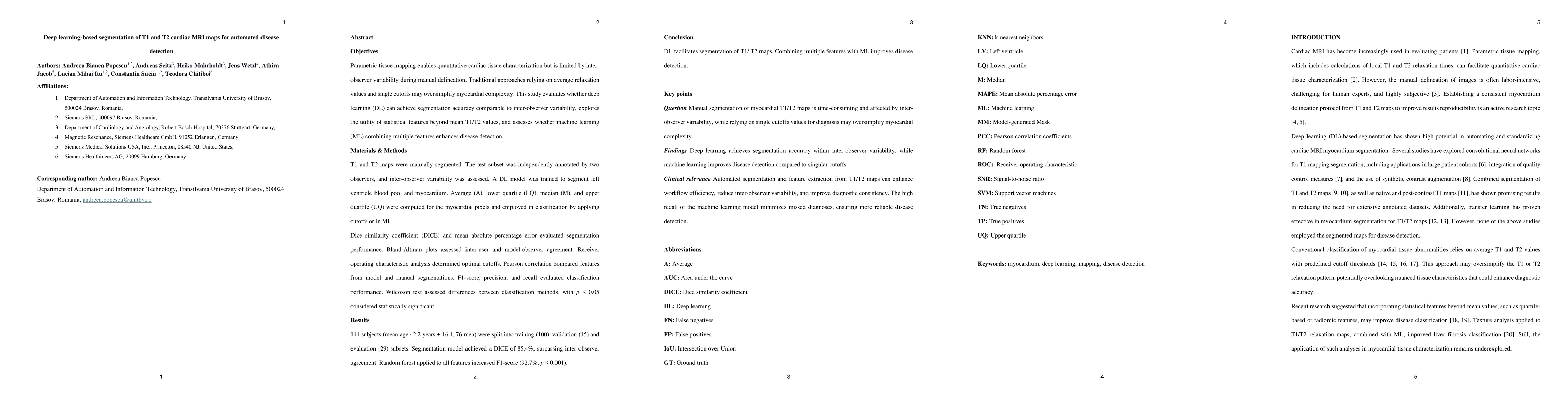 Objectives Parametric tissue mapping enables quantitative cardiac tissue characterization but is limited by inter-observer variability during manual delineation. Traditional approaches relying on average relaxation values and single cutoffs may oversimplify myocardial complexity. This study evaluates whether deep learning (DL) can achieve segmentation accuracy comparable to inter-observer variability, explores the utility of statistical features beyond mean T1/T2 values, and assesses whether machine learning (ML) combining multiple features enhances disease detection. Materials & Methods T1 and T2 maps were manually segmented. The test subset was independently annotated by two observers, and inter-observer variability was assessed. A DL model was trained to segment left ventricle blood pool and myocardium. Average (A), lower quartile (LQ), median (M), and upper quartile (UQ) were computed for the myocardial pixels and employed in classification by applying cutoffs or in ML. Dice similarity coefficient (DICE) and mean absolute percentage error evaluated segmentation performance. Bland-Altman plots assessed inter-user and model-observer agreement. Receiver operating characteristic analysis determined optimal cutoffs. Pearson correlation compared features from model and manual segmentations. F1-score, precision, and recall evaluated classification performance. Wilcoxon test assessed differences between classification methods, with p < 0.05 considered statistically significant. Results 144 subjects were split into training (100), validation (15) and evaluation (29) subsets. Segmentation model achieved a DICE of 85.4%, surpassing inter-observer agreement. Random forest applied to all features increased F1-score (92.7%, p < 0.001). Conclusion DL facilitates segmentation of T1/ T2 maps. Combining multiple features with ML improves disease detection.