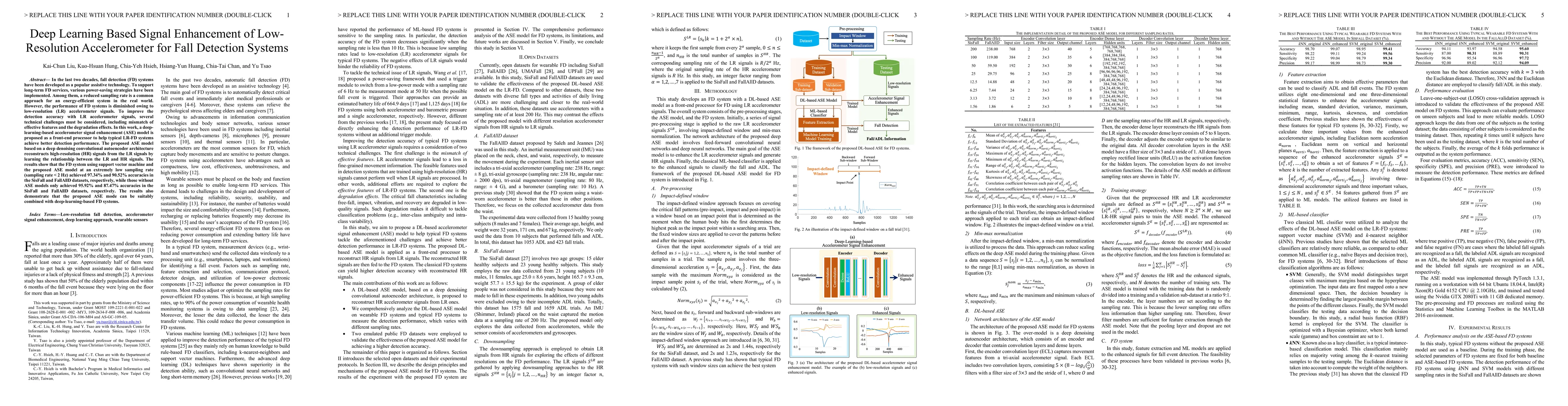 In the last two decades, fall detection (FD) systems have been developed as a popular assistive technology. Such systems automatically detect critical fall events and immediately alert medical professionals or caregivers. To support long-term FD services, various power-saving strategies have been implemented. Among them, a reduced sampling rate is a common approach for an energy-efficient system in the real-world. However, the performance of FD systems is diminished owing to low-resolution (LR) accelerometer signals. To improve the detection accuracy with LR accelerometer signals, several technical challenges must be considered, including misalignment, mismatch of effective features, and the degradation effects. In this work, a deep-learning-based accelerometer signal enhancement (ASE) model is proposed to improve the detection performance of LR-FD systems. This proposed model reconstructs high-resolution (HR) signals from the LR signals by learning the relationship between the LR and HR signals. The results show that the FD system using support vector machine and the proposed ASE model at an extremely low sampling rate (sampling rate < 2 Hz) achieved 97.34% and 90.52% accuracies in the SisFall and FallAllD datasets, respectively, while those without ASE models only achieved 95.92% and 87.47% accuracies in the SisFall and FallAllD datasets, respectively. This study demonstrates that the ASE model helps the FD systems tackle the technical challenges of LR signals and achieve better detection performance.