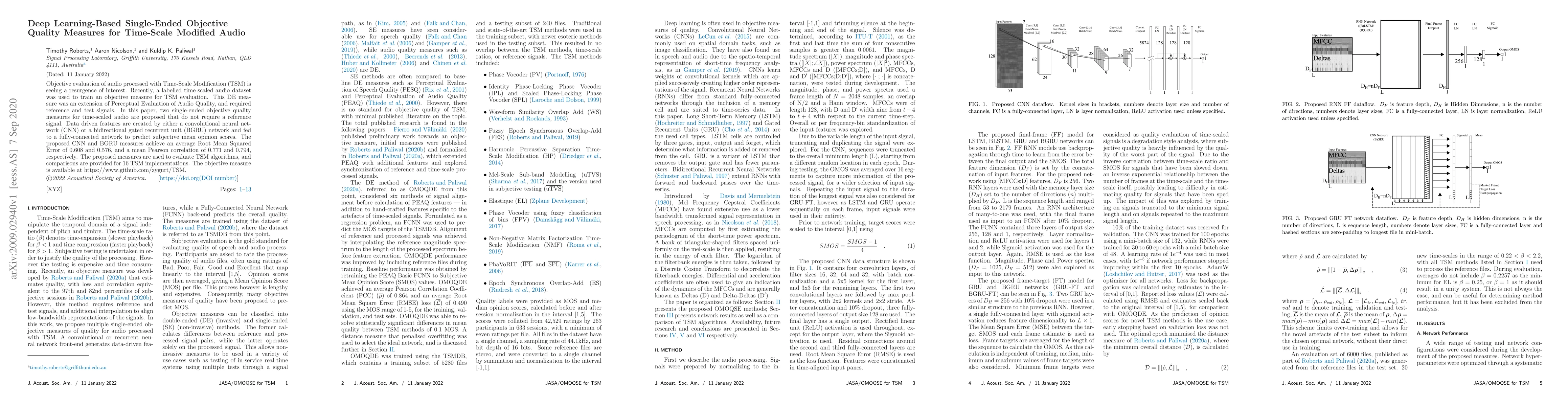 This research introduces two novel single-ended objective quality measures for evaluating time-scale modified audio without requiring a reference signal. The measures utilize data-driven features generated by either a convolutional neural network (CNN) or a bidirectional gated recurrent unit (BGRU) network, which predict subjective mean opinion scores. The proposed CNN and BGRU measures demonstrate promising results in evaluating TSM algorithms, with respective average RMSE and Pearson correlation values. The objective measure is accessible for further research at the provided GitHub link.