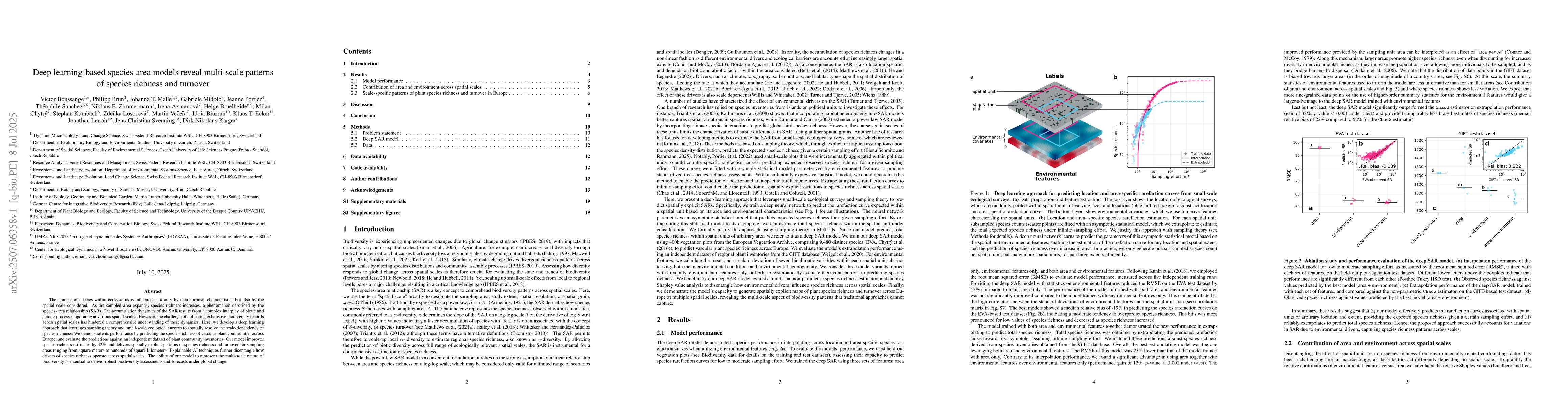 The number of species within ecosystems is influenced not only by their intrinsic characteristics but also by the spatial scale considered. As the sampled area expands, species richness increases, a phenomenon described by the species-area relationship (SAR). The accumulation dynamics of the SAR results from a complex interplay of biotic and abiotic processes operating at various spatial scales. However, the challenge of collecting exhaustive biodiversity records across spatial scales has hindered a comprehensive understanding of these dynamics. Here, we develop a deep learning approach that leverages sampling theory and small-scale ecological surveys to spatially resolve the scale-dependency of species richness. We demonstrate its performance by predicting the species richness of vascular plant communities across Europe, and evaluate the predictions against an independent dataset of plant community inventories. Our model improves species richness estimates by 32\% and delivers spatially explicit patterns of species richness and turnover for sampling areas ranging from square meters to hundreds of square kilometers. Explainable AI techniques further disentangle how drivers of species richness operate across spatial scales. The ability of our model to represent the multi-scale nature of biodiversity is essential to deliver robust biodiversity assessments and forecasts under global change.