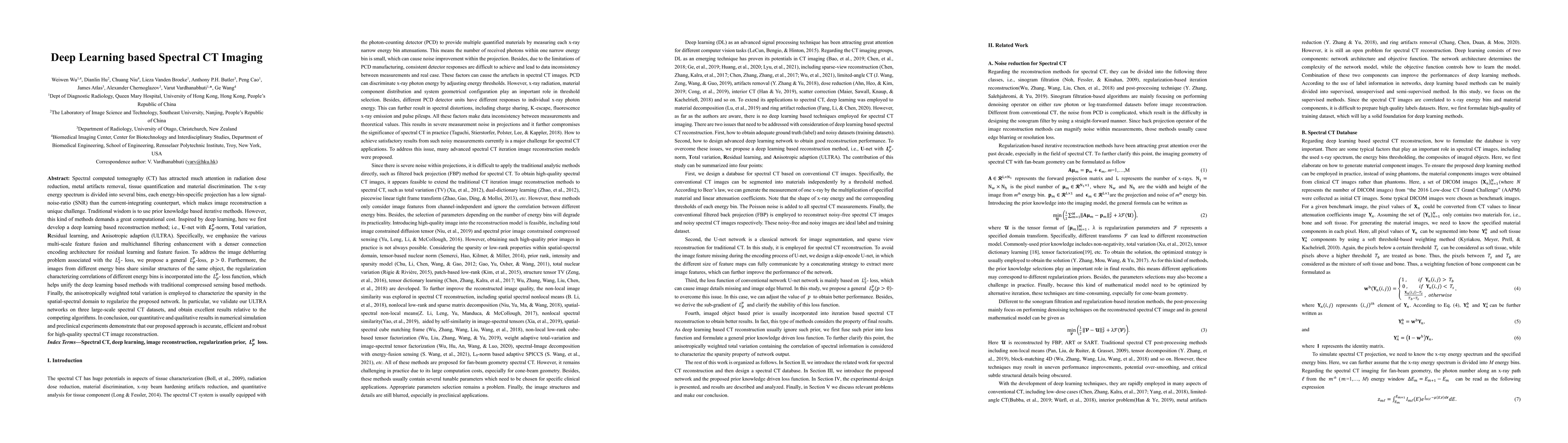 This paper proposes a deep learning-based method called ULTRA for spectral CT imaging reconstruction, addressing challenges like low signal-noise-ratio and image deblurring. The ULTRA network incorporates multi-scale feature fusion, multichannel filtering, and anisotropic total variation regularization, achieving superior performance compared to traditional methods in large-scale spectral CT datasets.