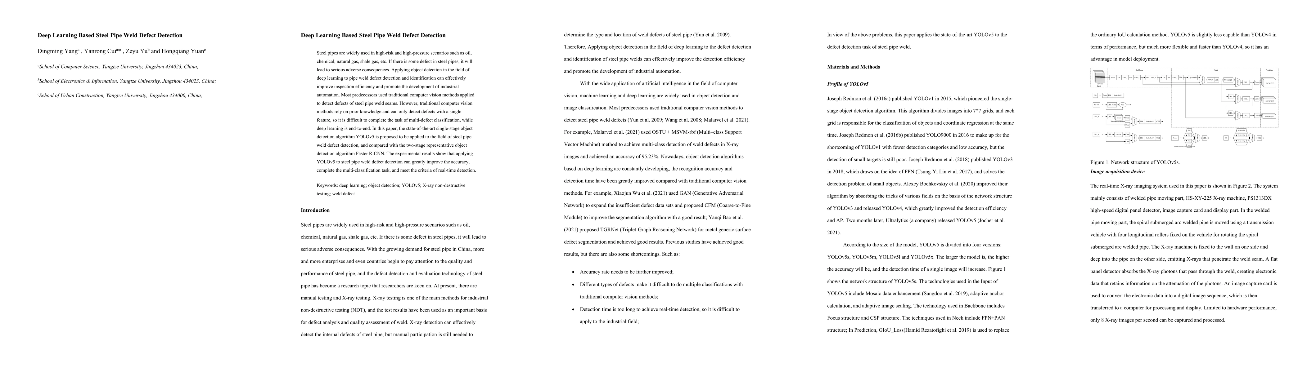 This paper proposes using the YOLOv5 deep learning algorithm for detecting and classifying defects in steel pipe welds, demonstrating improved accuracy and real-time detection compared to traditional methods and the Faster R-CNN algorithm. The study highlights the effectiveness of end-to-end deep learning for multi-defect classification in industrial automation.
