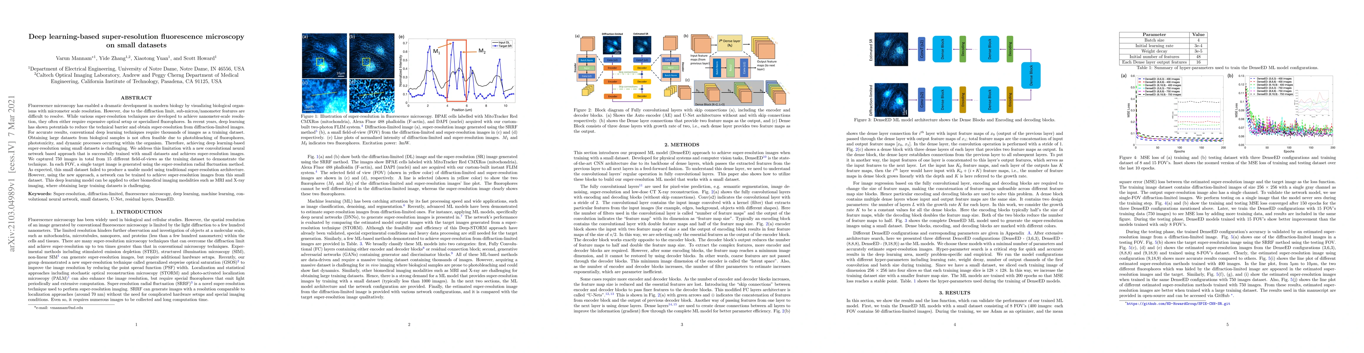 This paper proposes a convolutional neural network-based approach for deep learning-based super-resolution fluorescence microscopy that can effectively train on small datasets, overcoming the limitations of traditional methods that require large training sets. The new model successfully achieves super-resolution from a dataset of only 750 images, demonstrating its potential for use in other biomedical imaging modalities where large datasets are difficult to obtain.