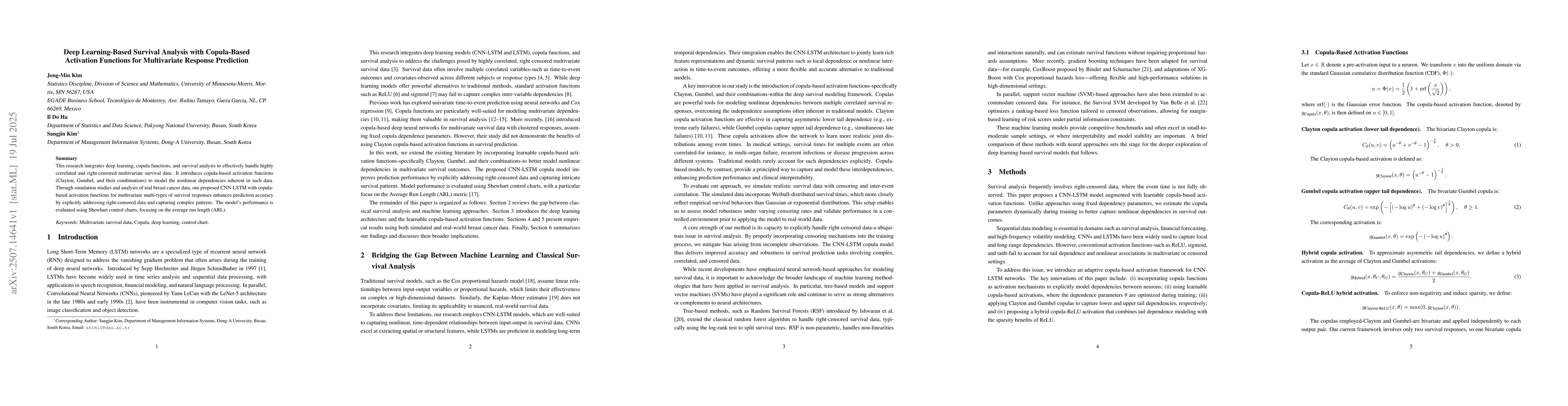 This research integrates deep learning, copula functions, and survival analysis to effectively handle highly correlated and right-censored multivariate survival data. It introduces copula-based activation functions (Clayton, Gumbel, and their combinations) to model the nonlinear dependencies inherent in such data. Through simulation studies and analysis of real breast cancer data, our proposed CNN-LSTM with copula-based activation functions for multivariate multi-types of survival responses enhances prediction accuracy by explicitly addressing right-censored data and capturing complex patterns. The model's performance is evaluated using Shewhart control charts, focusing on the average run length (ARL).