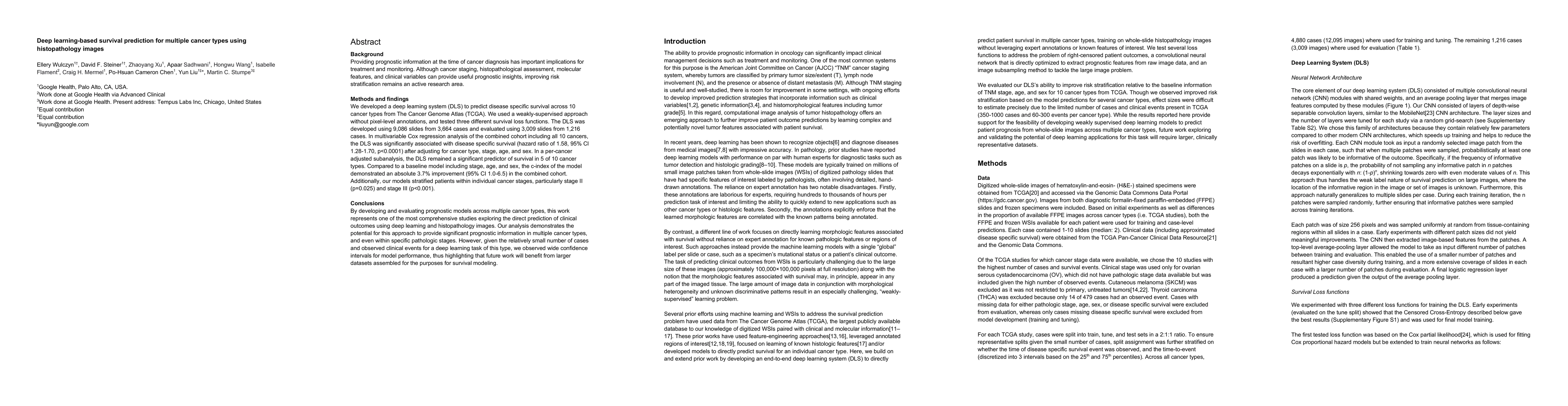 This study developed a deep learning system to predict disease-specific survival across 10 cancer types using histopathology images, showing significant predictive power in multivariable Cox regression analysis. The model demonstrated an absolute 3.7% improvement in c-index compared to traditional clinical predictors, highlighting its potential for enhancing prognostic information in oncology.