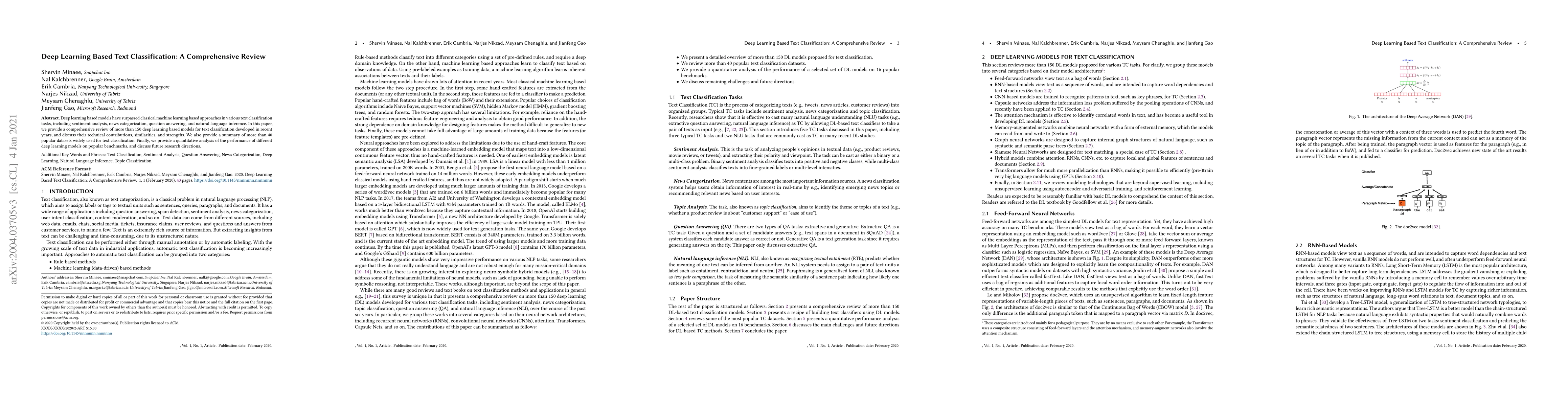 Deep learning based models have surpassed classical machine learning based approaches in various text classification tasks, including sentiment analysis, news categorization, question answering, and natural language inference. In this paper, we provide a comprehensive review of more than 150 deep learning based models for text classification developed in recent years, and discuss their technical contributions, similarities, and strengths. We also provide a summary of more than 40 popular datasets widely used for text classification. Finally, we provide a quantitative analysis of the performance of different deep learning models on popular benchmarks, and discuss future research directions.