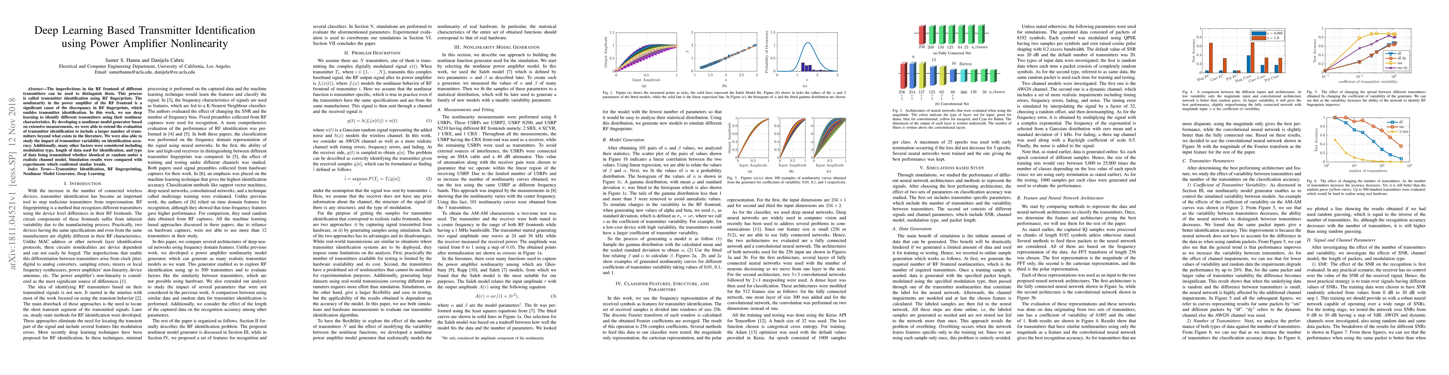 This paper explores deep learning techniques to identify transmitters based on the nonlinear characteristics of their power amplifiers, using extensive RF fingerprint measurements. The study evaluates the impact of transmitter variability, modulation type, and data length on identification accuracy, confirming trends through both simulations and experiments.