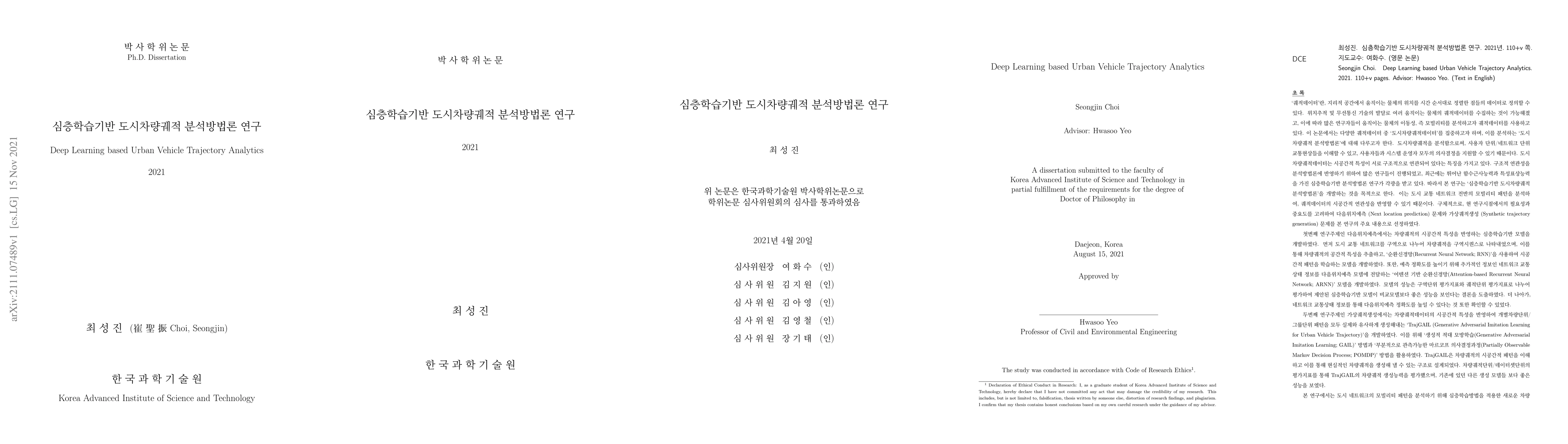 A `trajectory' refers to a trace generated by a moving object in geographical spaces, usually represented by of a series of chronologically ordered points, where each point consists of a geo-spatial coordinate set and a timestamp. Rapid advancements in location sensing and wireless communication technology enabled us to collect and store a massive amount of trajectory data. As a result, many researchers use trajectory data to analyze mobility of various moving objects. In this dissertation, we focus on the `urban vehicle trajectory,' which refers to trajectories of vehicles in urban traffic networks, and we focus on `urban vehicle trajectory analytics.' The urban vehicle trajectory analytics offers unprecedented opportunities to understand vehicle movement patterns in urban traffic networks including both user-centric travel experiences and system-wide spatiotemporal patterns. The spatiotemporal features of urban vehicle trajectory data are structurally correlated with each other, and consequently, many previous researchers used various methods to understand this structure. Especially, deep-learning models are getting attentions of many researchers due to its powerful function approximation and feature representation abilities. As a result, the objective of this dissertation is to develop deep-learning based models for urban vehicle trajectory analytics to better understand the mobility patterns of urban traffic networks. Particularly, this dissertation focuses on two research topics, which has high necessity, importance and applicability: Next Location Prediction, and Synthetic Trajectory Generation. In this study, we propose various novel models for urban vehicle trajectory analytics using deep learning.