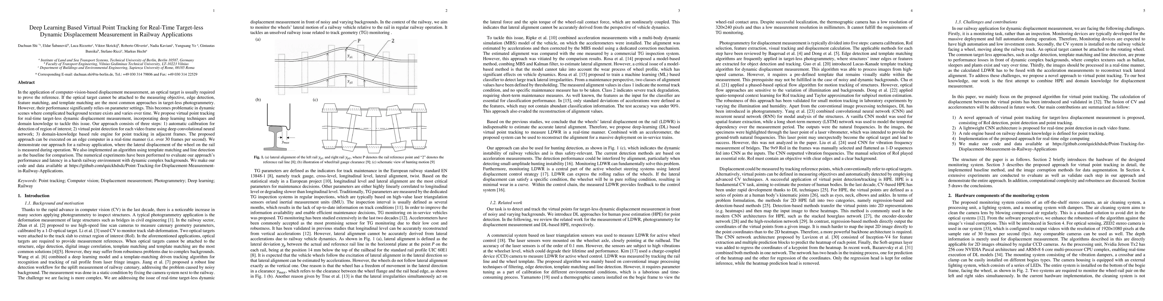 This paper proposes a deep learning-based method for real-time target-less dynamic displacement measurement in railway applications, using virtual point tracking. The approach involves automatic calibration, deep convolutional neural network-based virtual point detection, and a domain-knowledge rule engine for tracking, achieving real-time performance and outperforming traditional template matching methods in challenging railway environments.