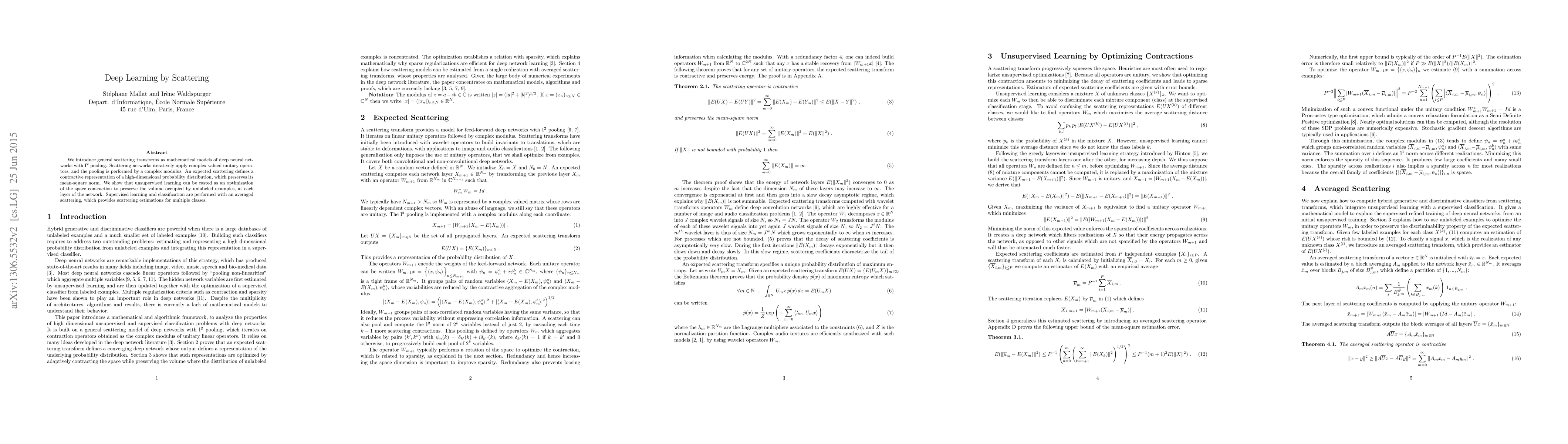 This paper introduces scattering networks that learn from complex valued unitary operators to capture high-dimensional probability distributions. It shows how unsupervised learning can optimize the contraction of feature spaces to preserve volume occupied by unlabeled examples.