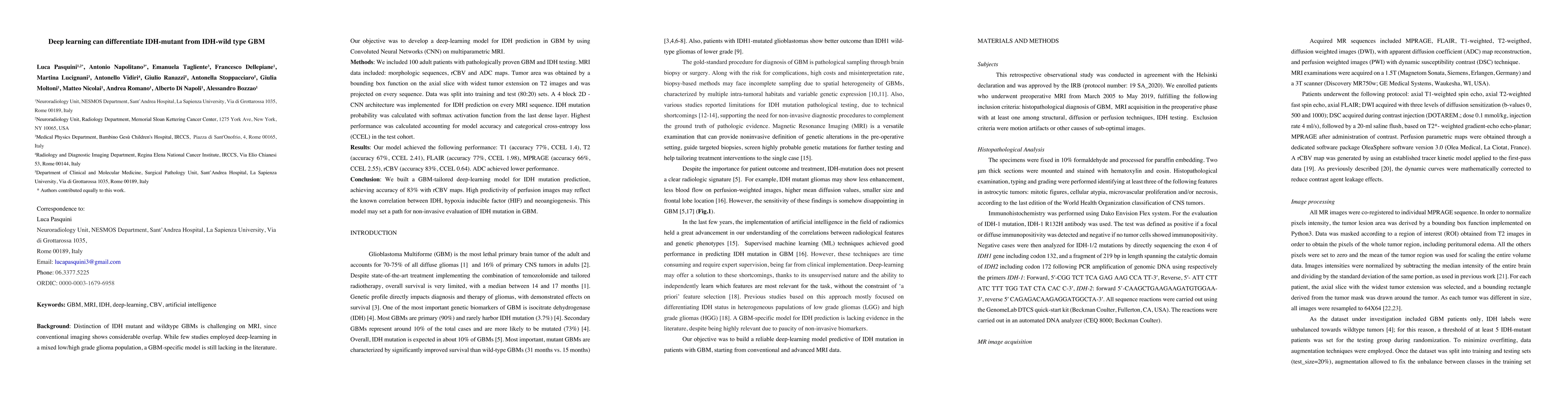 Background: Distinction of IDH mutant and wildtype GBMs is challenging on MRI, since conventional imaging shows considerable overlap. While few studies employed deep-learning in a mixed low/high grade glioma population, a GBM-specific model is still lacking in the literature. Our objective was to develop a deep-learning model for IDH prediction in GBM by using Convoluted Neural Networks (CNN) on multiparametric MRI. Methods: We included 100 adult patients with pathologically proven GBM and IDH testing. MRI data included: morphologic sequences, rCBV and ADC maps. Tumor area was obtained by a bounding box function on the axial slice with widest tumor extension on T2 images and was projected on every sequence. Data was split into training and test (80:20) sets. A 4 block 2D - CNN architecture was implemented for IDH prediction on every MRI sequence. IDH mutation probability was calculated with softmax activation function from the last dense layer. Highest performance was calculated accounting for model accuracy and categorical cross-entropy loss (CCEL) in the test cohort. Results: Our model achieved the following performance: T1 (accuracy 77%, CCEL 1.4), T2 (accuracy 67%, CCEL 2.41), FLAIR (accuracy 77%, CCEL 1.98), MPRAGE (accuracy 66%, CCEL 2.55), rCBV (accuracy 83%, CCEL 0.64). ADC achieved lower performance. Conclusion: We built a GBM-tailored deep-learning model for IDH mutation prediction, achieving accuracy of 83% with rCBV maps. High predictivity of perfusion images may reflect the known correlation between IDH, hypoxia inducible factor (HIF) and neoangiogenesis. This model may set a path for non-invasive evaluation of IDH mutation in GBM.