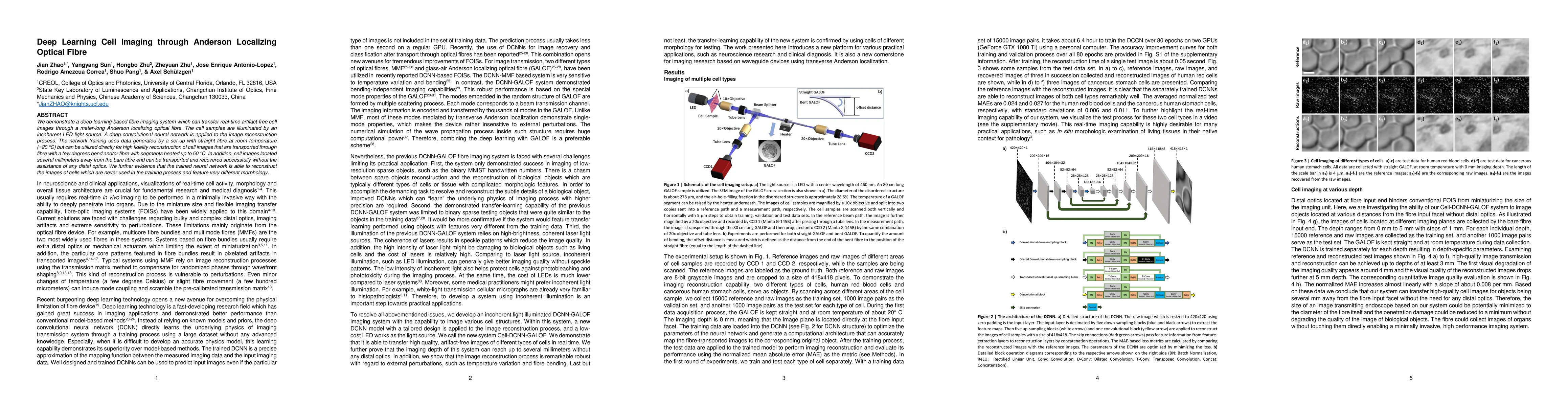 We demonstrate a deep-learning-based fibre imaging system which can transfer real-time artifact-free cell images through a meter-long Anderson localizing optical fibre. The cell samples are illuminated by an incoherent LED light source. A deep convolutional neural network is applied to the image reconstruction process. The network training uses data generated by a set-up with straight fibre at room temperature (~20 {\deg}C) but can be utilized directly for high fidelity reconstruction of cell images that are transported through fibre with a few degrees bend and/or fibre with segments heated up to 50 {\deg}C. In addition, cell images located several millimeters away from the bare fibre end can be transported and recovered successfully without the assistance of any distal optics. We further evidence that the trained neural network is able to reconstruct the images of cells which are never used in the training process and feature very different morphology.