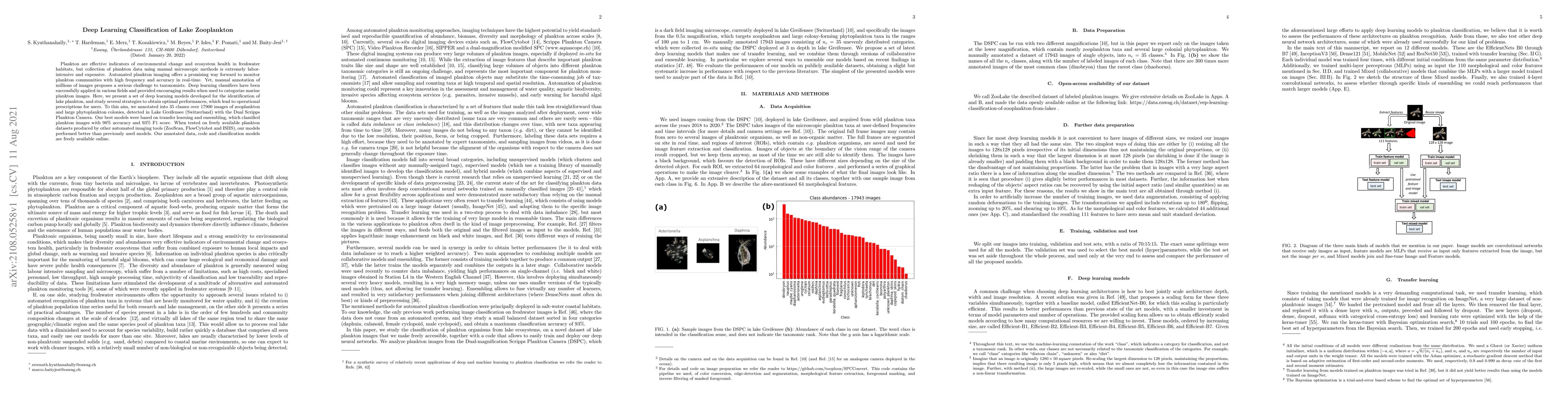 Plankton are effective indicators of environmental change and ecosystem health in freshwater habitats, but collection of plankton data using manual microscopic methods is extremely labor-intensive and expensive. Automated plankton imaging offers a promising way forward to monitor plankton communities with high frequency and accuracy in real-time. Yet, manual annotation of millions of images proposes a serious challenge to taxonomists. Deep learning classifiers have been successfully applied in various fields and provided encouraging results when used to categorize marine plankton images. Here, we present a set of deep learning models developed for the identification of lake plankton, and study several strategies to obtain optimal performances,which lead to operational prescriptions for users. To this aim, we annotated into 35 classes over 17900 images of zooplankton and large phytoplankton colonies, detected in Lake Greifensee (Switzerland) with the Dual Scripps Plankton Camera. Our best models were based on transfer learning and ensembling, which classified plankton images with 98% accuracy and 93% F1 score. When tested on freely available plankton datasets produced by other automated imaging tools (ZooScan, FlowCytobot and ISIIS), our models performed better than previously used models. Our annotated data, code and classification models are freely available online.
