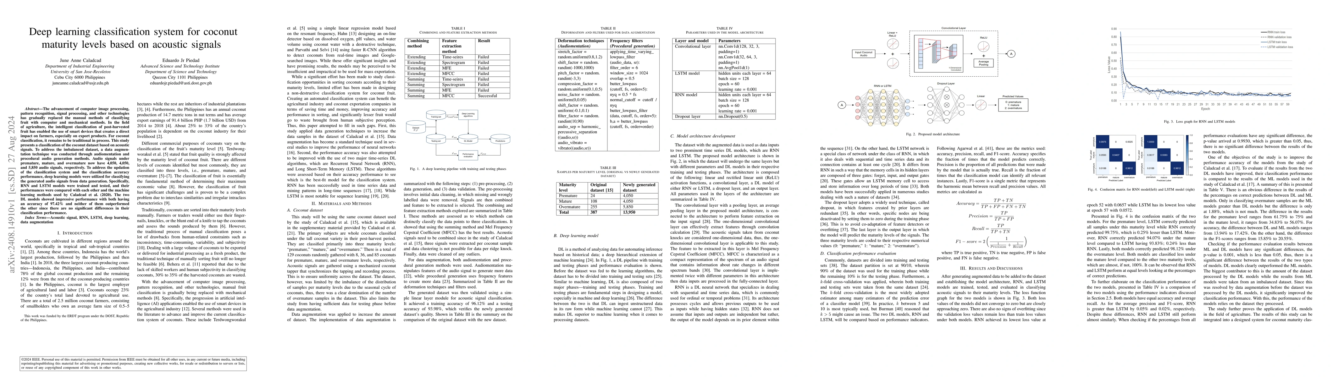 This study introduces a deep learning classification system for determining coconut maturity levels using acoustic signals, addressing the traditional methods by employing RNN and LSTM models. Both models achieved an accuracy of 97.42%, showing no significant difference in performance compared to machine learning methods.