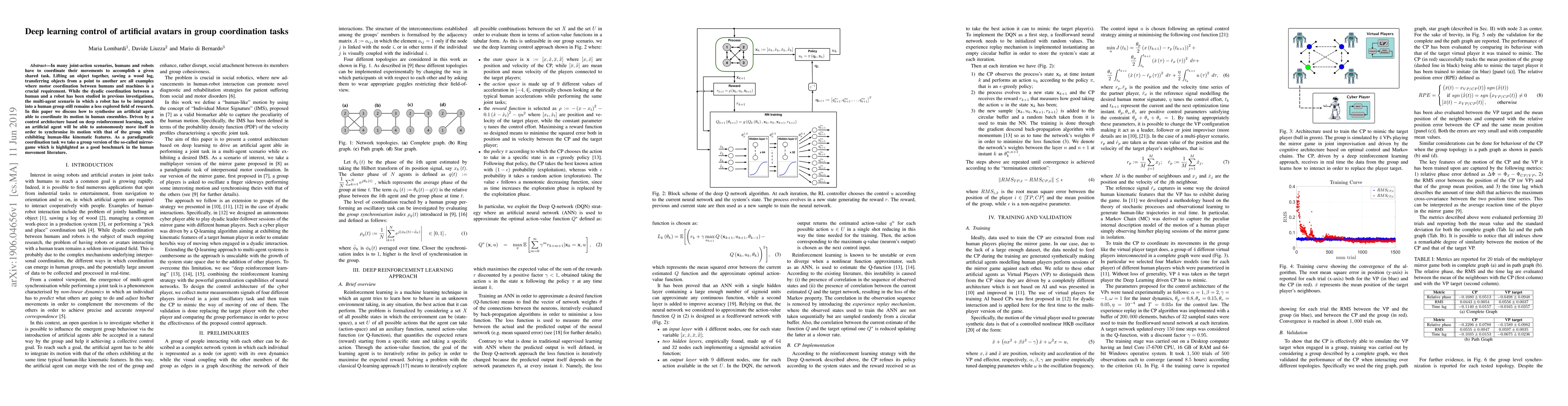 In many joint-action scenarios, humans and robots have to coordinate their movements to accomplish a given shared task. Lifting an object together, sawing a wood log, transferring objects from a point to another are all examples where motor coordination between humans and machines is a crucial requirement. While the dyadic coordination between a human and a robot has been studied in previous investigations, the multi-agent scenario in which a robot has to be integrated into a human group still remains a less explored field of research. In this paper we discuss how to synthesise an artificial agent able to coordinate its motion in human ensembles. Driven by a control architecture based on deep reinforcement learning, such an artificial agent will be able to autonomously move itself in order to synchronise its motion with that of the group while exhibiting human-like kinematic features. As a paradigmatic coordination task we take a group version of the so-called mirror-game which is highlighted as a good benchmark in the human movement literature.