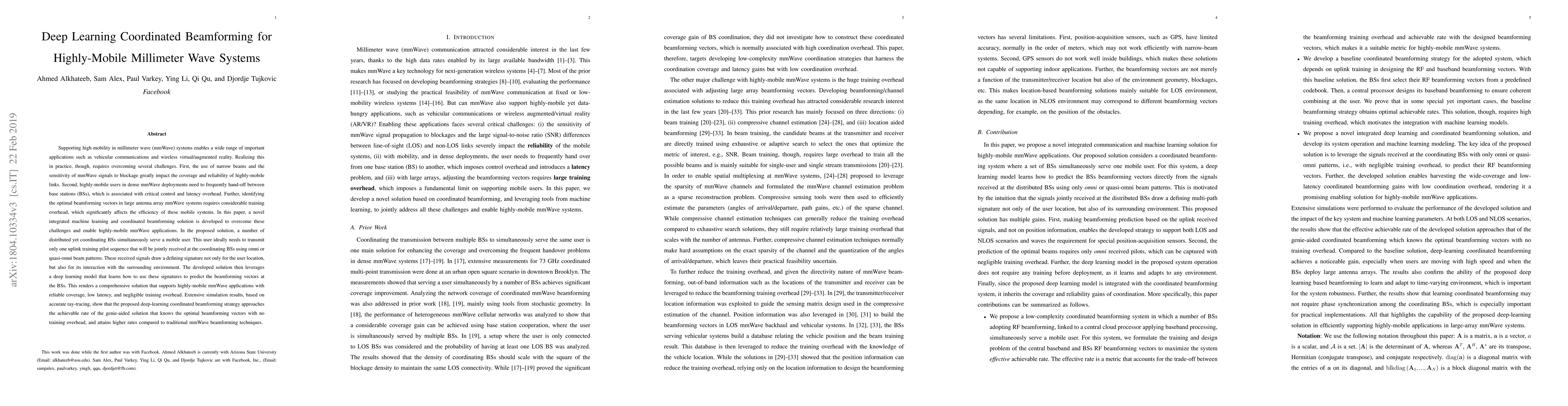 This paper proposes a deep learning coordinated beamforming approach to address the challenges of high mobility in millimeter wave (mmWave) systems, including beam blockage, frequent hand-offs, and training overhead. The solution leverages distributed base stations to use a single uplink training pilot, enabling deep learning to predict optimal beamforming vectors, achieving reliable coverage and low latency.