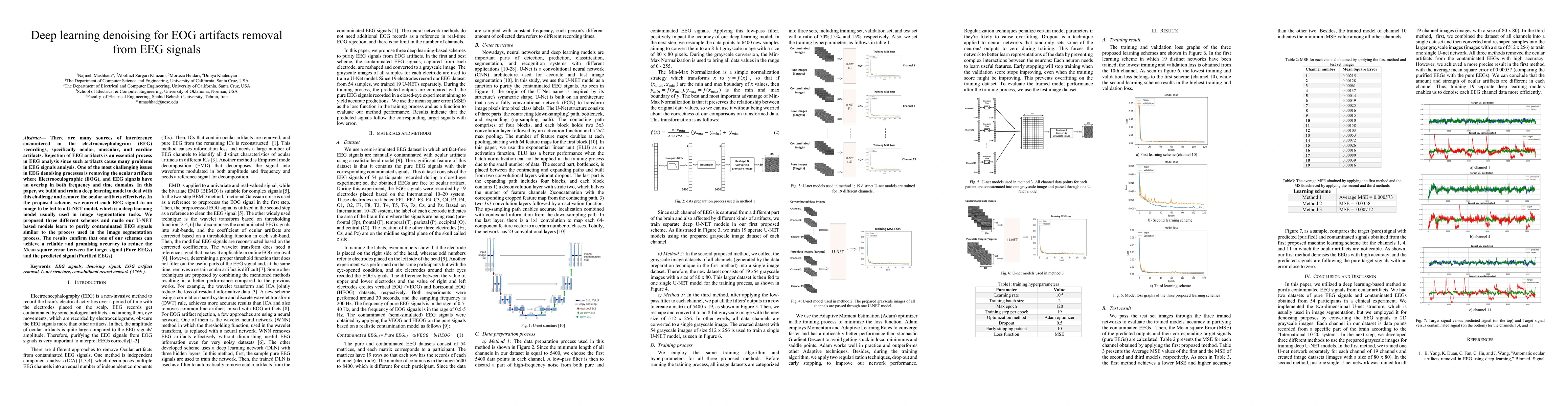 This paper proposes a deep learning approach using a U-NET model to remove ocular artifacts from EEG signals by converting EEG data into images. The results show that the method can effectively reduce the mean square error between pure and predicted EEG signals, demonstrating promising accuracy in artifact removal.