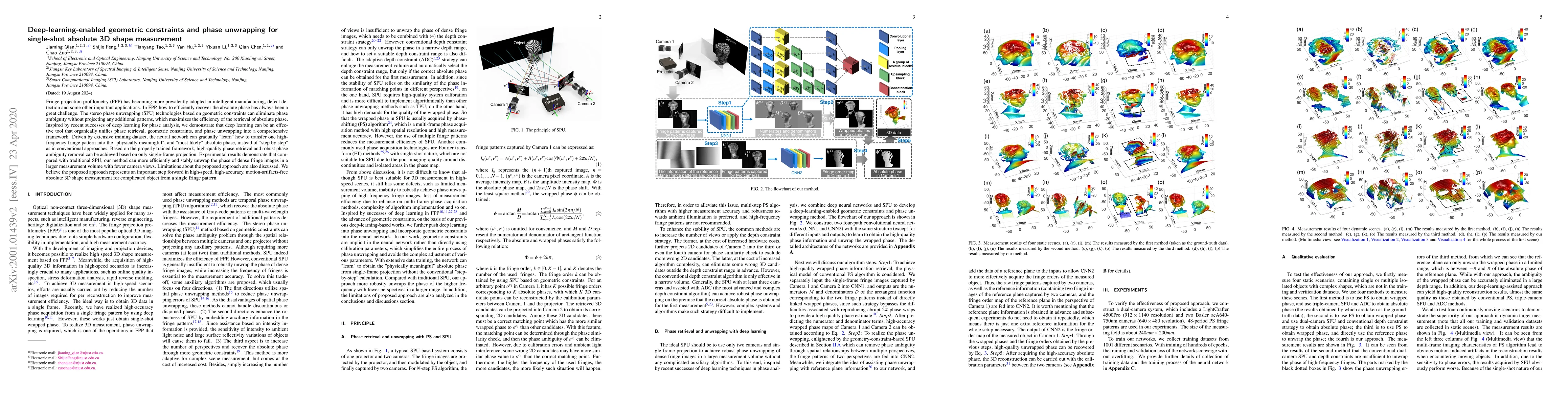 This paper proposes a deep-learning-enabled framework for the efficient and accurate retrieval of absolute 3D shape using single-shot fringe projection profilometry. The method leverages deep learning to unify phase retrieval, geometric constraints, and phase unwrapping, achieving high-quality phase unwrapping without additional fringe patterns.