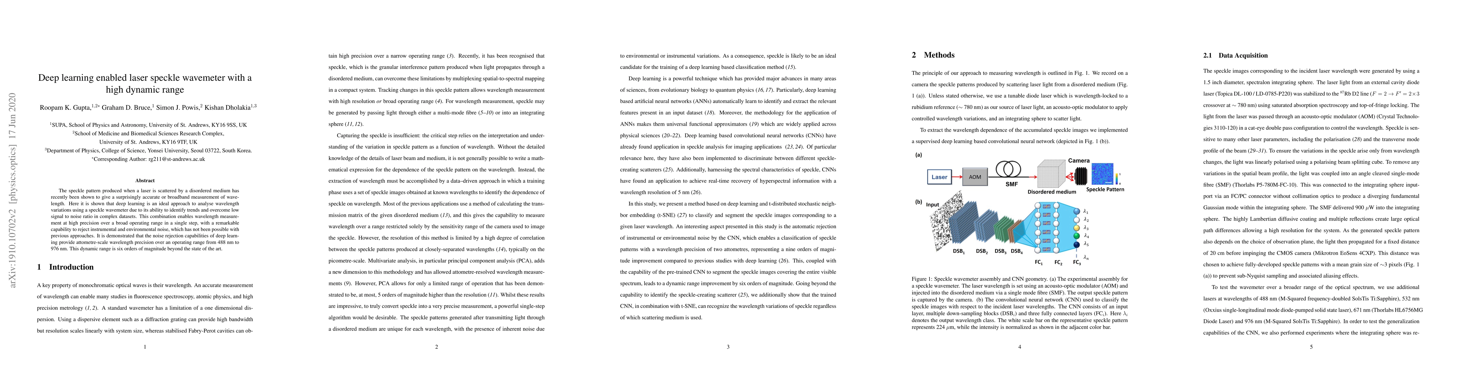 The speckle pattern produced when a laser is scattered by a disordered medium has recently been shown to give a surprisingly accurate or broadband measurement of wavelength. Here it is shown that deep learning is an ideal approach to analyse wavelength variations using a speckle wavemeter due to its ability to identify trends and overcome low signal to noise ratio in complex datasets. This combination enables wavelength measurement at high precision over a broad operating range in a single step, with a remarkable capability to reject instrumental and environmental noise, which has not been possible with previous approaches. It is demonstrated that the noise rejection capabilities of deep learning provide attometre-scale wavelength precision over an operating range from 488 nm to 976 nm. This dynamic range is six orders of magnitude beyond the state of the art.
