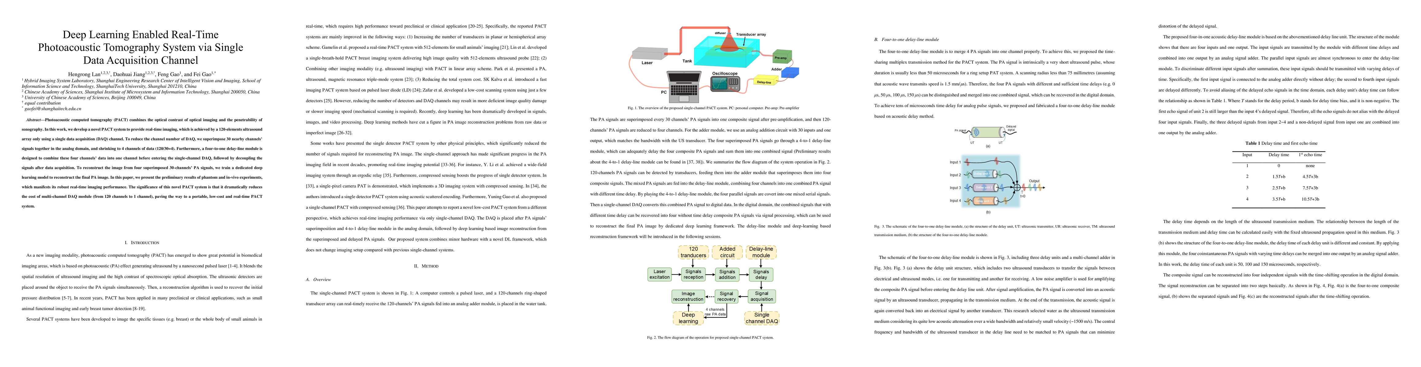 Photoacoustic computed tomography (PACT) combines the optical contrast of optical imaging and the penetrability of sonography. In this work, we develop a novel PACT system to provide real-time imaging, which is achieved by a 120-elements ultrasound array only using a single data acquisition (DAQ) channel. To reduce the channel number of DAQ, we superimpose 30 nearby channels' signals together in the analog domain, and shrinking to 4 channels of data (120/30=4). Furthermore, a four-to-one delay-line module is designed to combine these four channels' data into one channel before entering the single-channel DAQ, followed by decoupling the signals after data acquisition. To reconstruct the image from four superimposed 30-channels'PA signals, we train a dedicated deep learning model to reconstruct the final PA image. In this paper, we present the preliminary results of phantom and in-vivo experiments, which manifests its robust real-time imaging performance. The significance of this novel PACT system is that it dramatically reduces the cost of multi-channel DAQ module (from 120 channels to 1 channel), paving the way to a portable, low-cost and real-time PACT system.