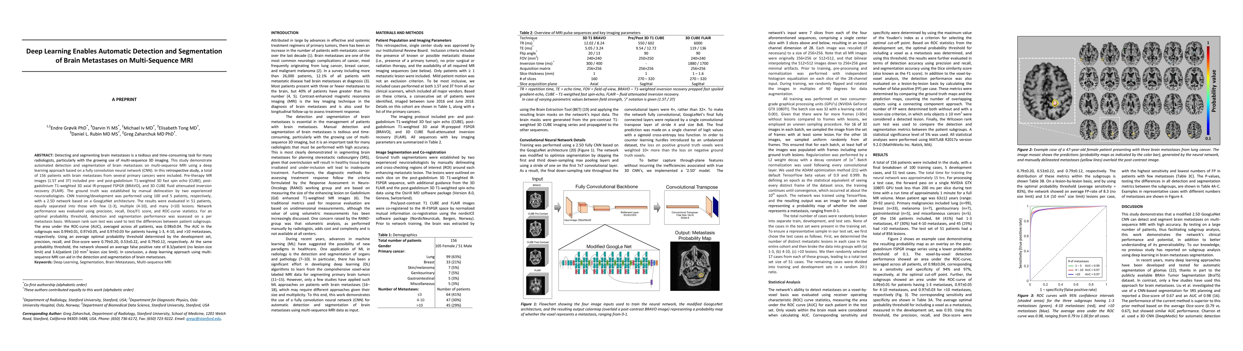 This study employs a deep learning method based on a fully convolutional neural network (CNN) to automate the detection and segmentation of brain metastases on multi-sequence MRI. The CNN achieved high performance with an average AUC of 0.98, demonstrating potential to assist radiologists in managing brain metastases.
