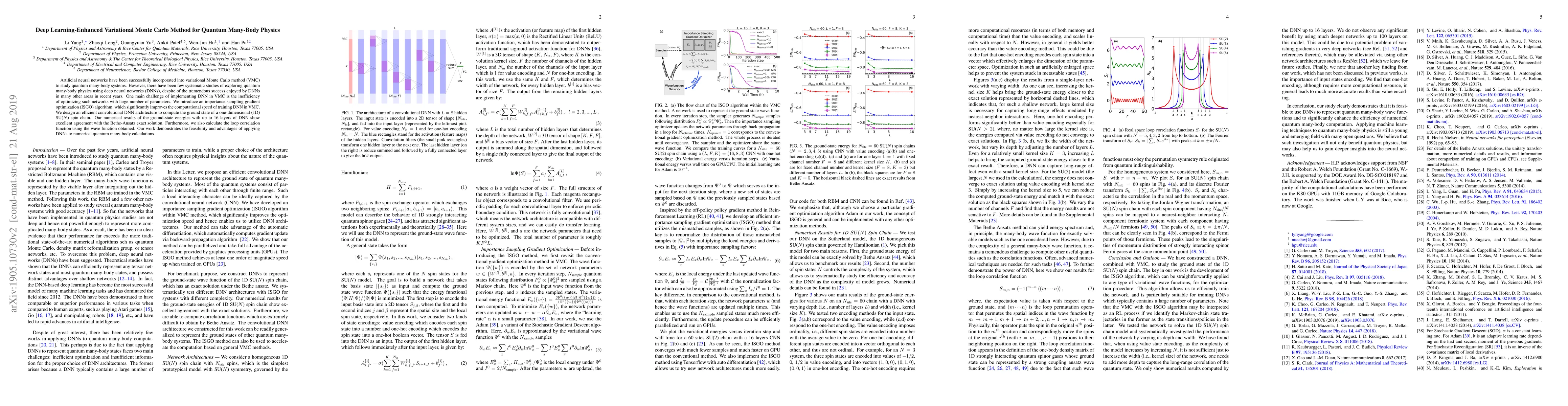 This paper introduces a deep learning-enhanced variational Monte Carlo method using an importance sampling gradient optimization algorithm to efficiently train deep neural networks for quantum many-body physics. The proposed convolutional DNN architecture successfully computes ground state energies of a 1D SU($N$) spin chain, showing excellent agreement with exact solutions.