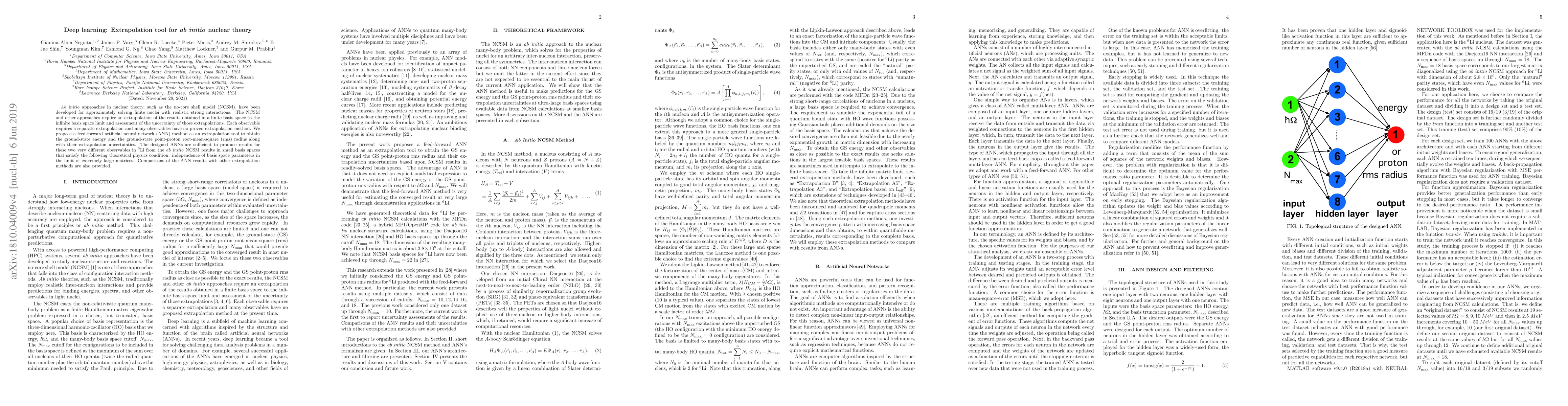 This paper proposes using feed-forward artificial neural networks (ANNs) to extrapolate results from ab initio nuclear theory, specifically the no-core shell model (NCSM), to the infinite basis space limit. The ANNs successfully predict ground state energy and root-mean-square radius for $^6$Li, demonstrating comparable accuracy to traditional extrapolation methods.