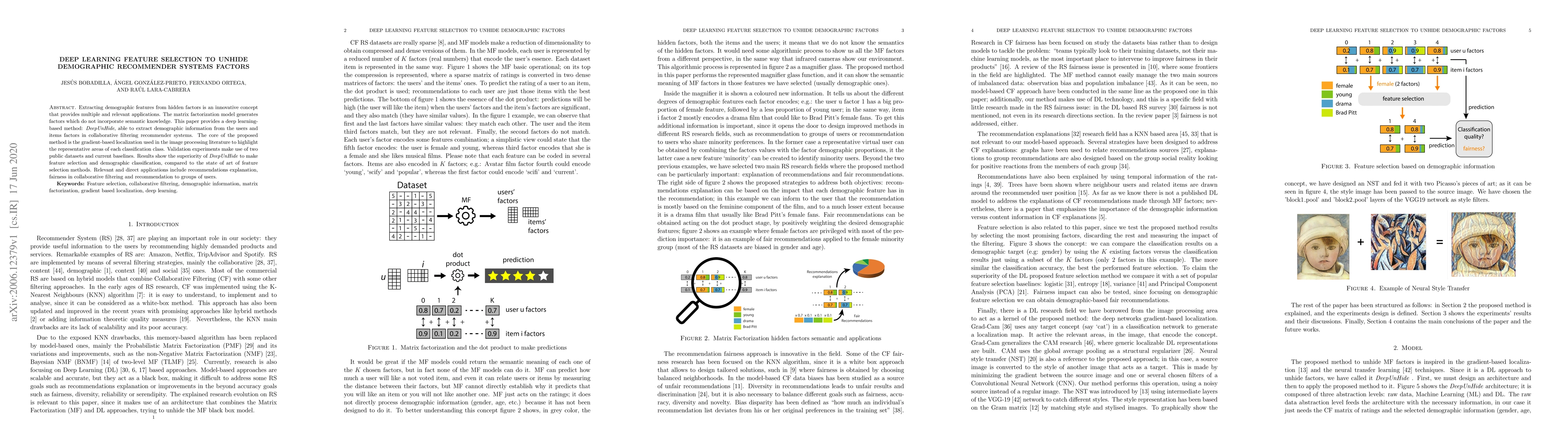 Extracting demographic features from hidden factors is an innovative concept that provides multiple and relevant applications. The matrix factorization model generates factors which do not incorporate semantic knowledge. This paper provides a deep learning-based method: DeepUnHide, able to extract demographic information from the users and items factors in collaborative filtering recommender systems. The core of the proposed method is the gradient-based localization used in the image processing literature to highlight the representative areas of each classification class. Validation experiments make use of two public datasets and current baselines. Results show the superiority of DeepUnHide to make feature selection and demographic classification, compared to the state of art of feature selection methods. Relevant and direct applications include recommendations explanation, fairness in collaborative filtering and recommendation to groups of users.