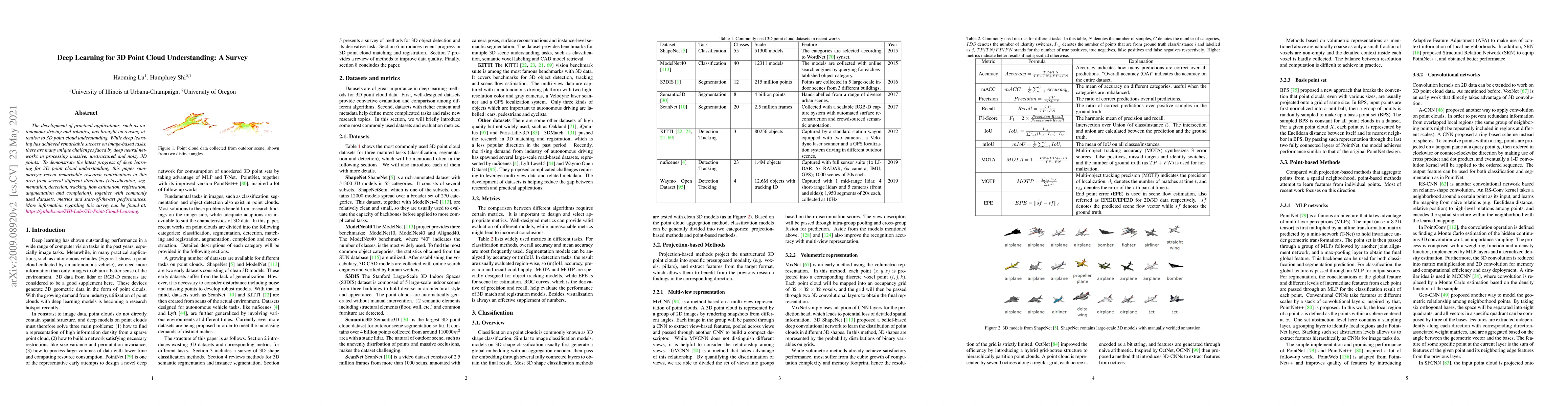 This paper surveys recent advancements in deep learning for 3D point cloud understanding, highlighting significant contributions in areas like classification, segmentation, and detection, while addressing the unique challenges of processing unstructured 3D data. It also reviews commonly used datasets, metrics, and state-of-the-art performances.