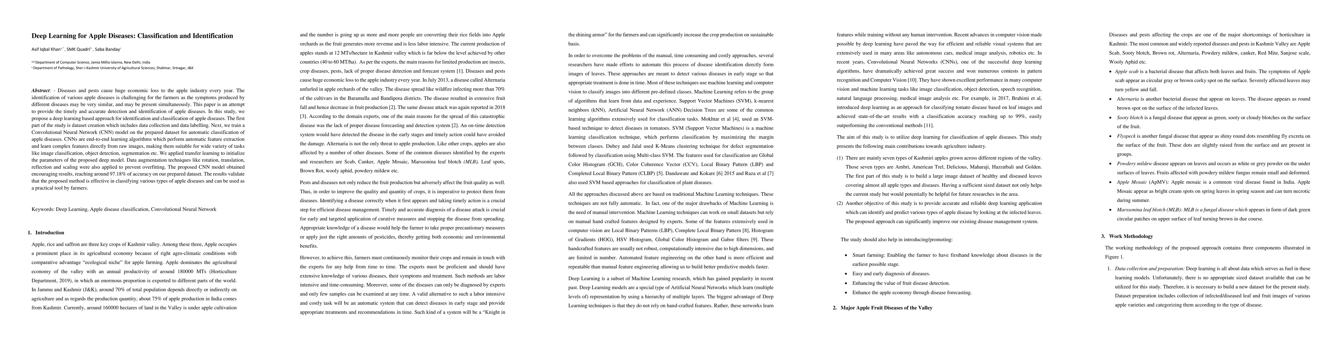 This paper proposes a deep learning approach using Convolutional Neural Networks (CNNs) for the accurate classification of apple diseases, achieving 97.18% accuracy. The study involves creating a dataset, applying transfer learning, and using data augmentation techniques to enhance the model's performance and prevent overfitting.