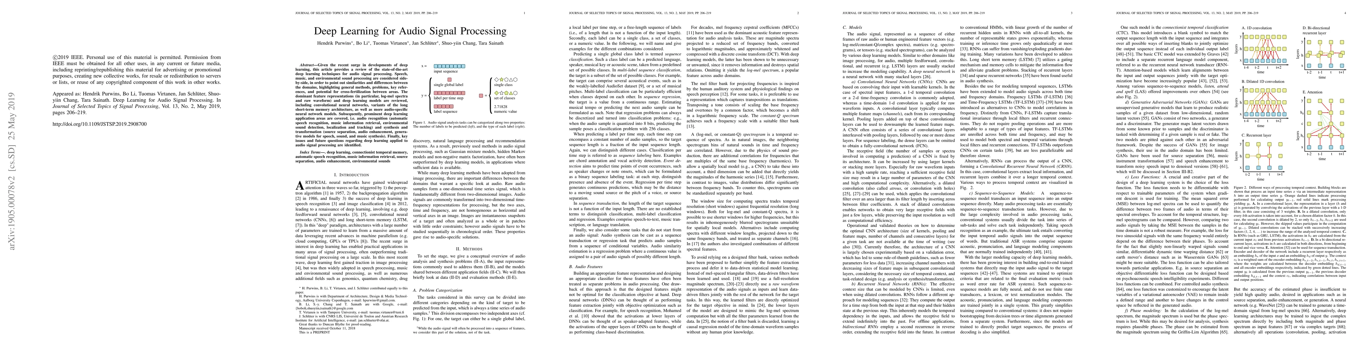This paper reviews state-of-the-art deep learning techniques for audio signal processing, comparing speech, music, and environmental sound processing. It surveys dominant feature representations, deep learning models, and applications like audio recognition and synthesis, while identifying key issues and future research directions.