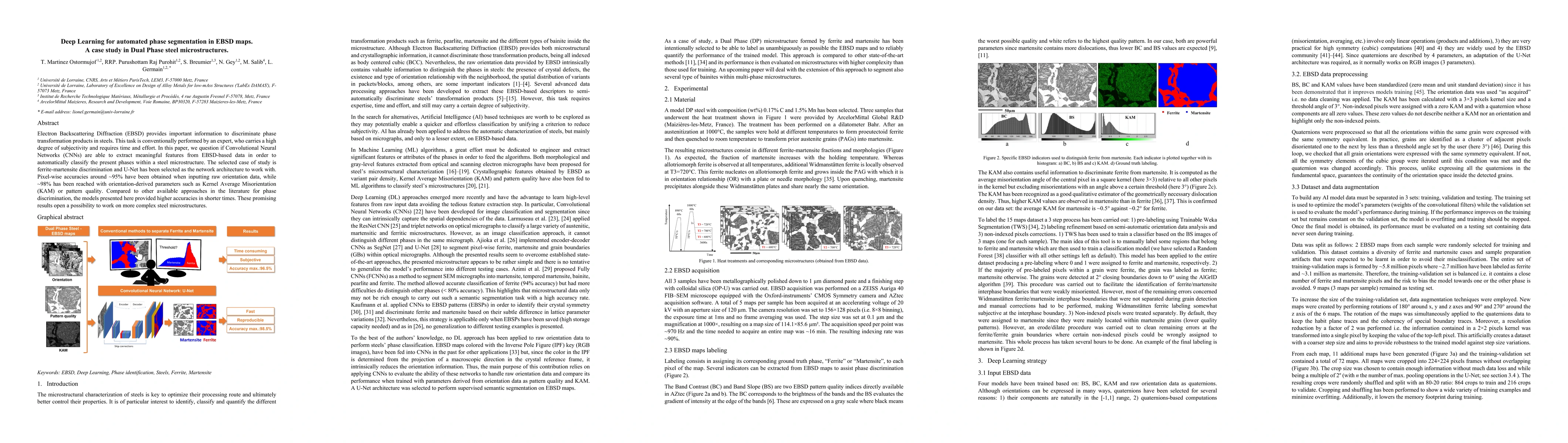 This paper explores the use of Convolutional Neural Networks (CNNs) and U-Net architecture for automated phase segmentation in Electron Backscattering Diffraction (EBSD) maps, achieving ~95% accuracy with raw data and ~98% with derived parameters, outperforming conventional methods. The study focuses on ferrite-martensite discrimination in dual-phase steel microstructures.