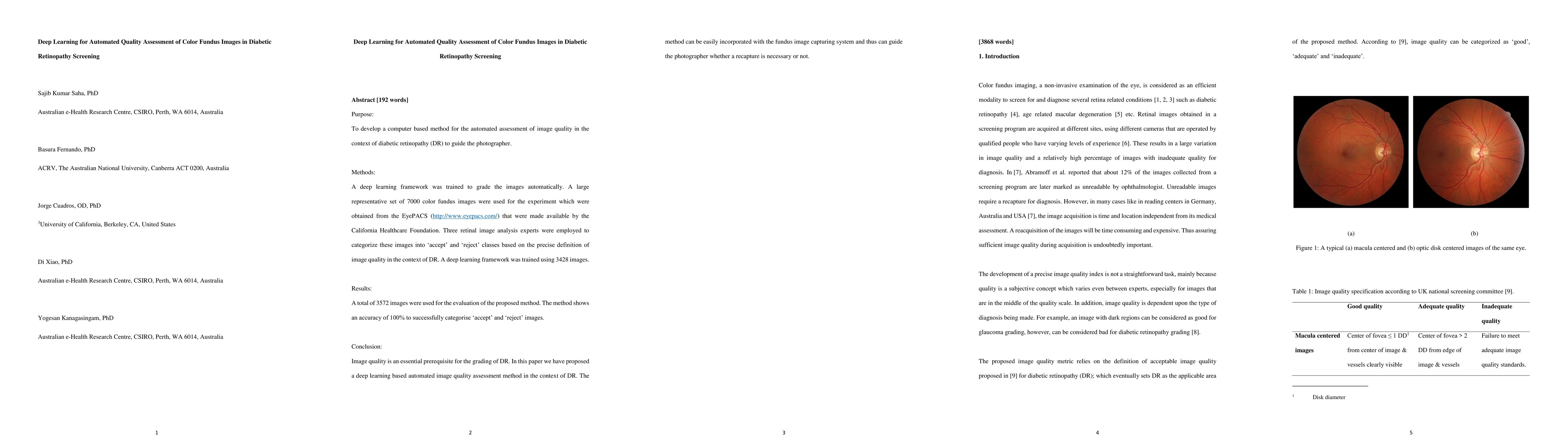 This paper proposes a deep learning framework to automatically assess the quality of color fundus images for diabetic retinopathy screening, achieving 100% accuracy in categorizing images as acceptable or rejectable, thus aiding photographers in determining if a retake is needed.