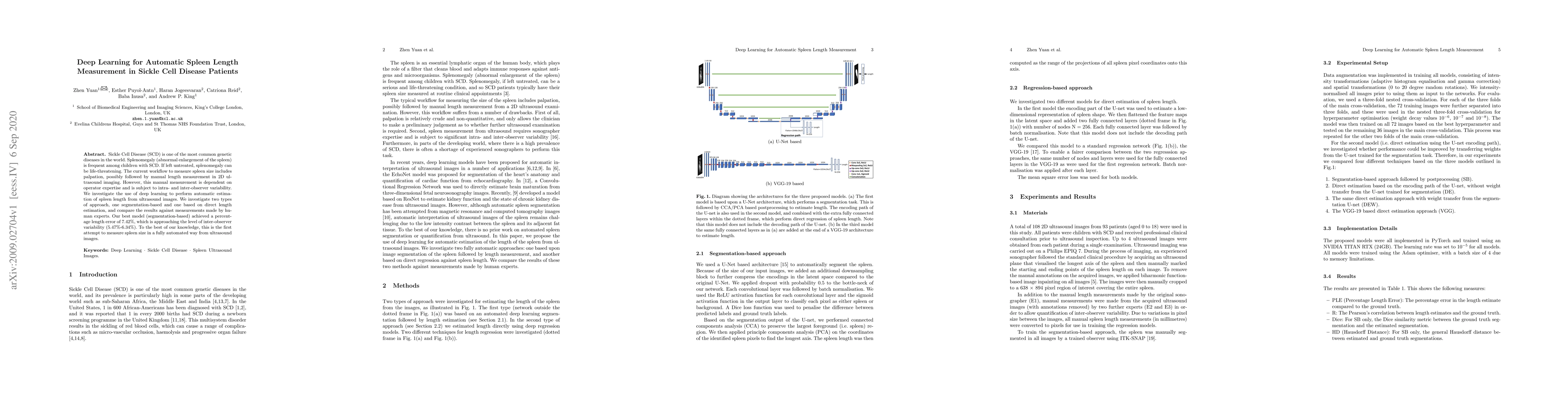 This paper explores the use of deep learning for automatic spleen length measurement in sickle cell disease patients, aiming to reduce variability and improve accuracy compared to manual methods. The best model achieved a 7.42% error rate, nearing the inter-observer variability, marking the first fully automated approach for this task.