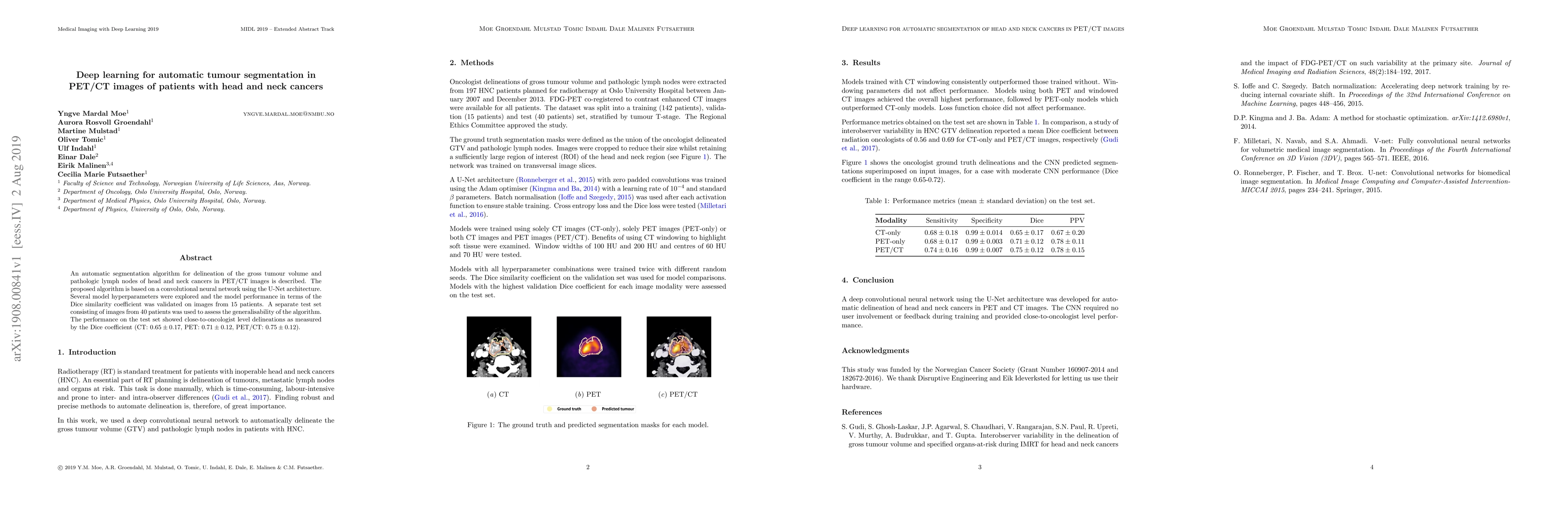 This paper proposes a convolutional neural network based on U-Net architecture for automatic tumour segmentation in PET/CT images of head and neck cancer patients. The algorithm's performance, validated by the Dice similarity coefficient, shows close-to-oncologist level delineations on a test set of 40 patients.