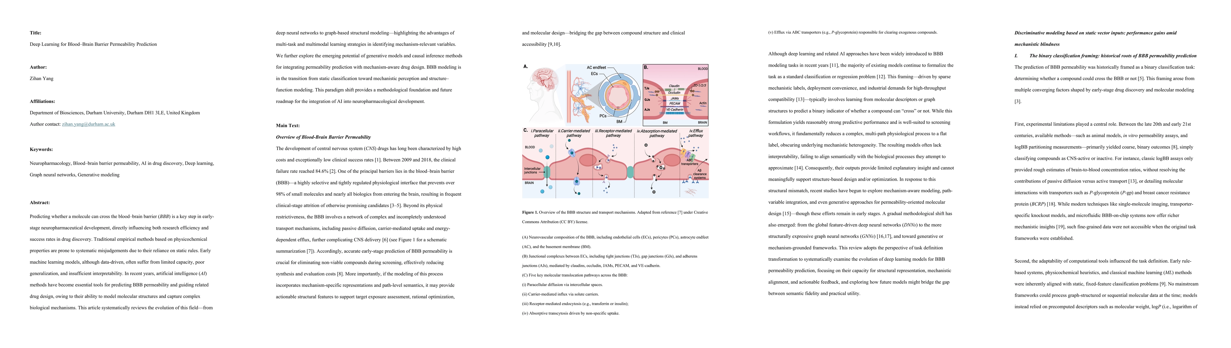 Predicting whether a molecule can cross the blood-brain barrier (BBB) is a key step in early-stage neuropharmaceutical development, directly influencing both research efficiency and success rates in drug discovery. Traditional empirical methods based on physicochemical properties are prone to systematic misjudgements due to their reliance on static rules. Early machine learning models, although data-driven, often suffer from limited capacity, poor generalization, and insufficient interpretability. In recent years, artificial intelligence (AI) methods have become essential tools for predicting BBB permeability and guiding related drug design, owing to their ability to model molecular structures and capture complex biological mechanisms. This article systematically reviews the evolution of this field-from deep neural networks to graph-based structural modeling-highlighting the advantages of multi-task and multimodal learning strategies in identifying mechanism-relevant variables. We further explore the emerging potential of generative models and causal inference methods for integrating permeability prediction with mechanism-aware drug design. BBB modeling is in the transition from static classification toward mechanistic perception and structure-function modeling. This paradigm shift provides a methodological foundation and future roadmap for the integration of AI into neuropharmacological development.