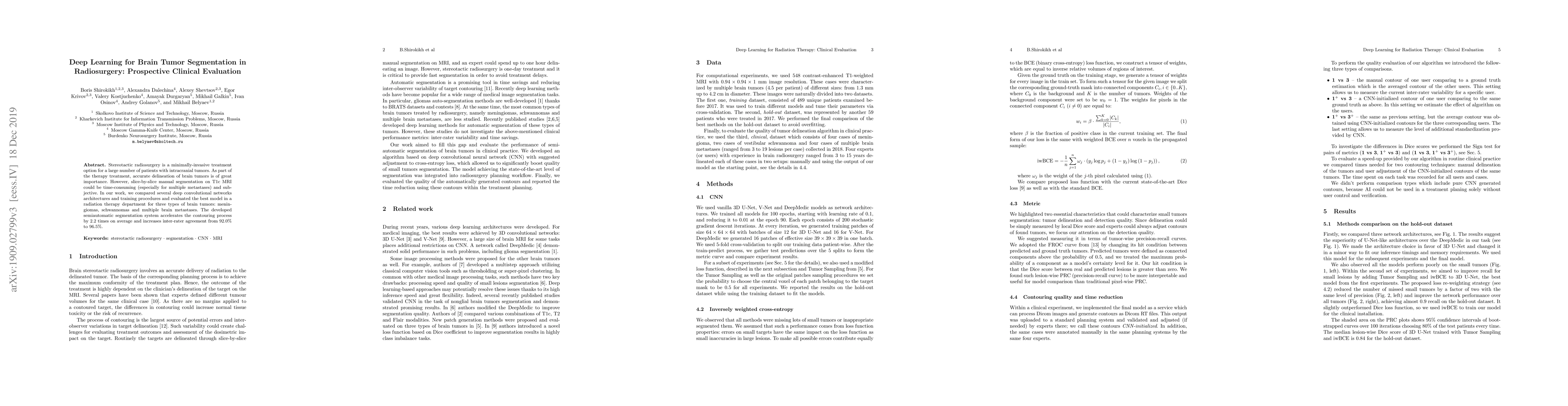 This study evaluates deep learning models for brain tumor segmentation in radiosurgery, finding that a semiautomatic system based on convolutional neural networks significantly accelerates the contouring process by 2.2 times and improves inter-rater agreement from 92.0% to 96.5%.
