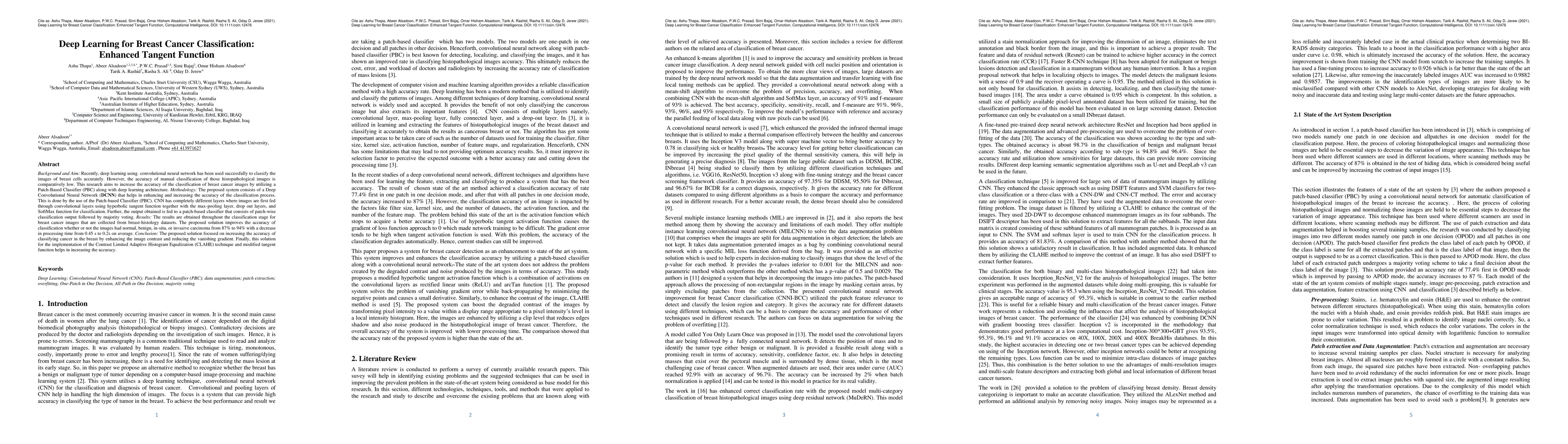 This research proposes a Deep Convolutional Neural Network (DCNN) with a Patch-Based Classifier (PBC) to enhance breast cancer image classification accuracy, achieving a 94% success rate from 87% with reduced processing time. The use of a modified tangent function and CLAHE technique further improves classification precision.