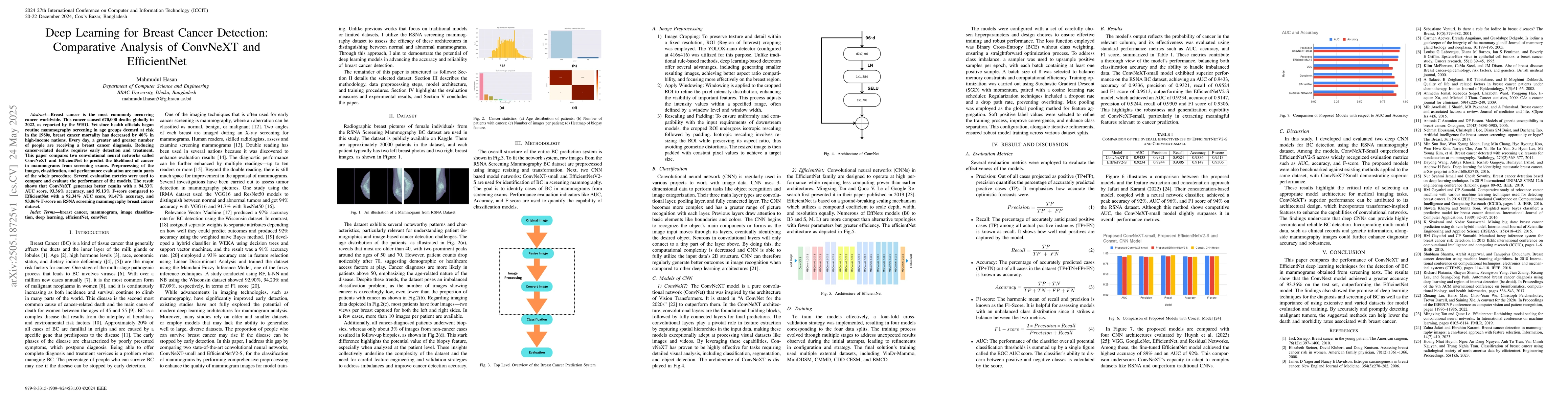 The research presents a comparative analysis of ConvNeXT-small and EfficientNetV2-S for breast cancer detection in mammograms, demonstrating ConvNeXT-small's superior performance.