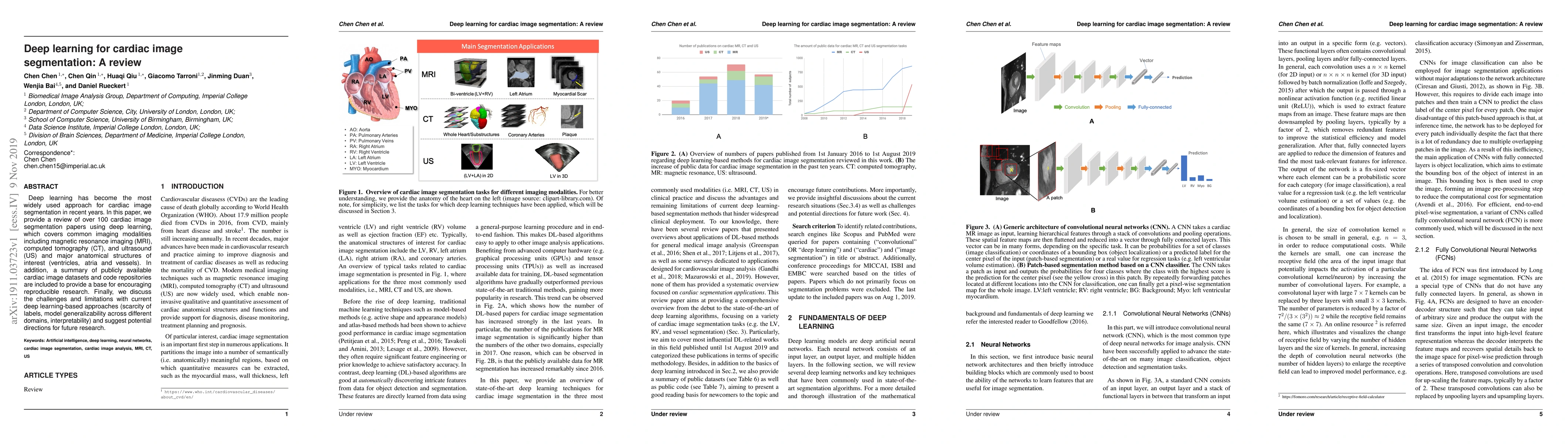 This paper reviews over 100 deep learning applications for cardiac image segmentation across MRI, CT, and ultrasound modalities, focusing on ventricles, atria, and vessels. It also highlights available datasets and code repositories, discusses challenges like label scarcity and model generalizability, and proposes future research directions.