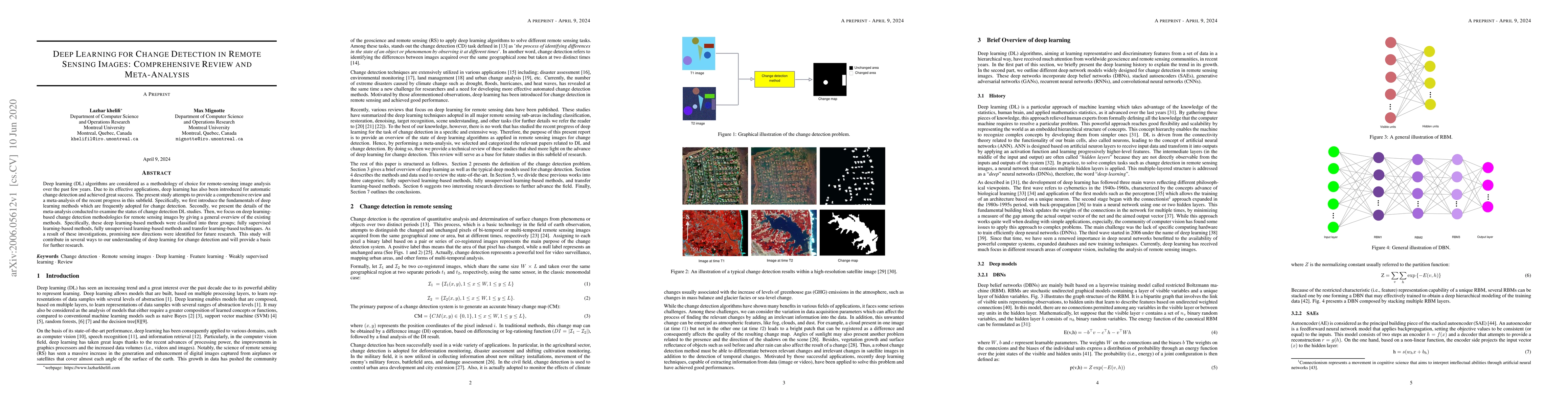 This paper provides a comprehensive review and meta-analysis of deep learning methodologies for change detection in remote sensing images, classifying existing methods into supervised, unsupervised, and transfer learning techniques, and identifying promising new research directions.