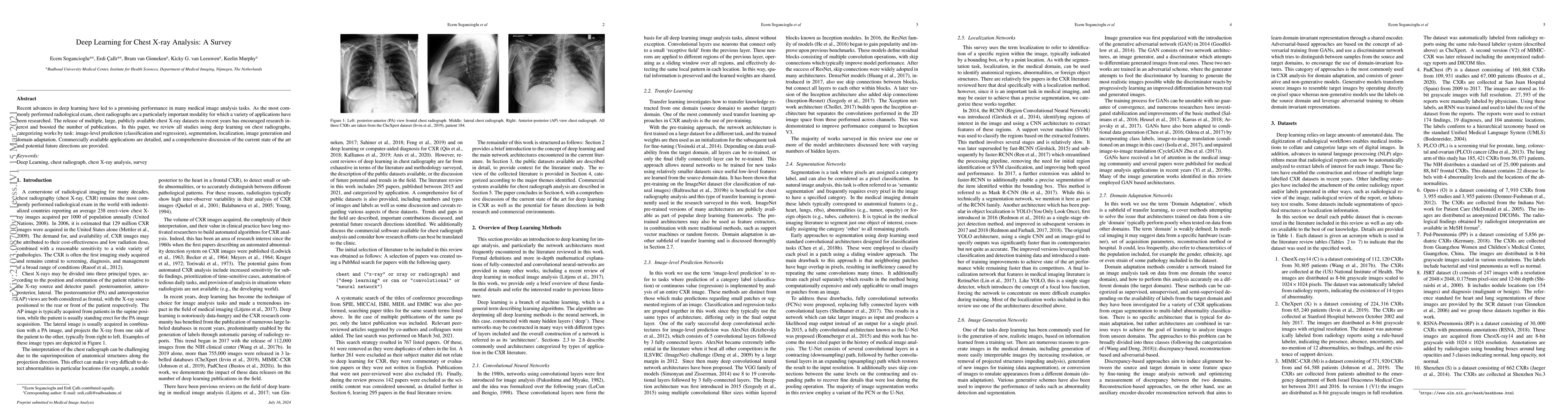 This paper surveys the application of deep learning techniques to chest X-ray analysis, categorizing studies by task such as classification, segmentation, and localization. It highlights the impact of publicly available datasets and discusses current advancements and future research directions in the field.
