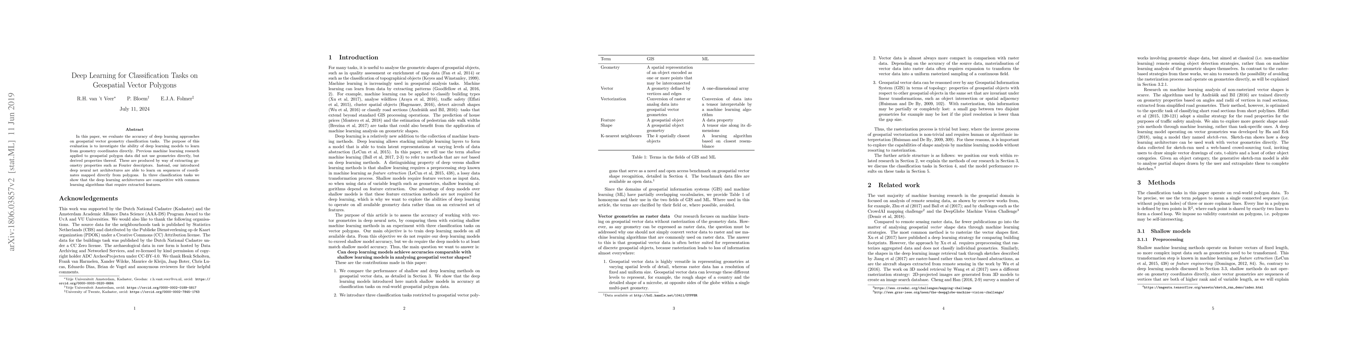 In this paper, we evaluate the accuracy of deep learning approaches on geospatial vector geometry classification tasks. The purpose of this evaluation is to investigate the ability of deep learning models to learn from geometry coordinates directly. Previous machine learning research applied to geospatial polygon data did not use geometries directly, but derived properties thereof. These are produced by way of extracting geometry properties such as Fourier descriptors. Instead, our introduced deep neural net architectures are able to learn on sequences of coordinates mapped directly from polygons. In three classification tasks we show that the deep learning architectures are competitive with common learning algorithms that require extracted features.